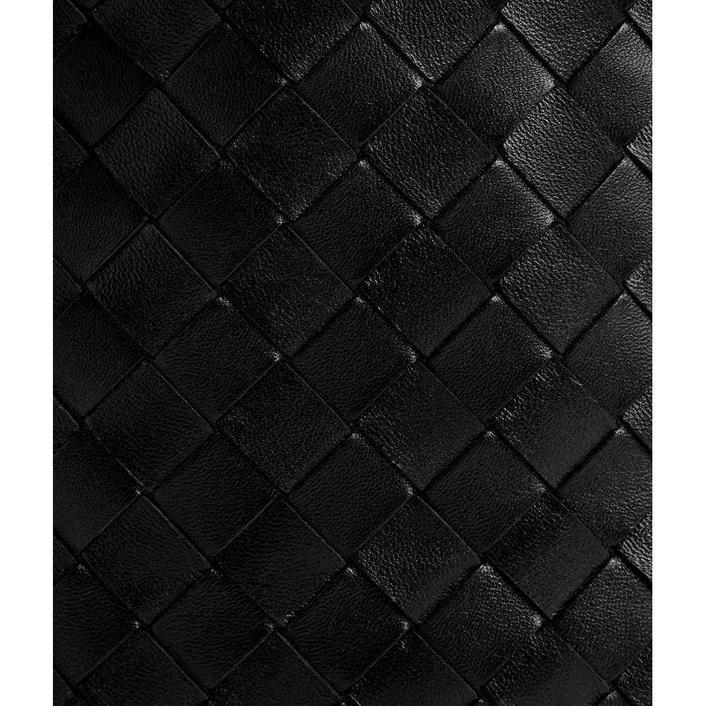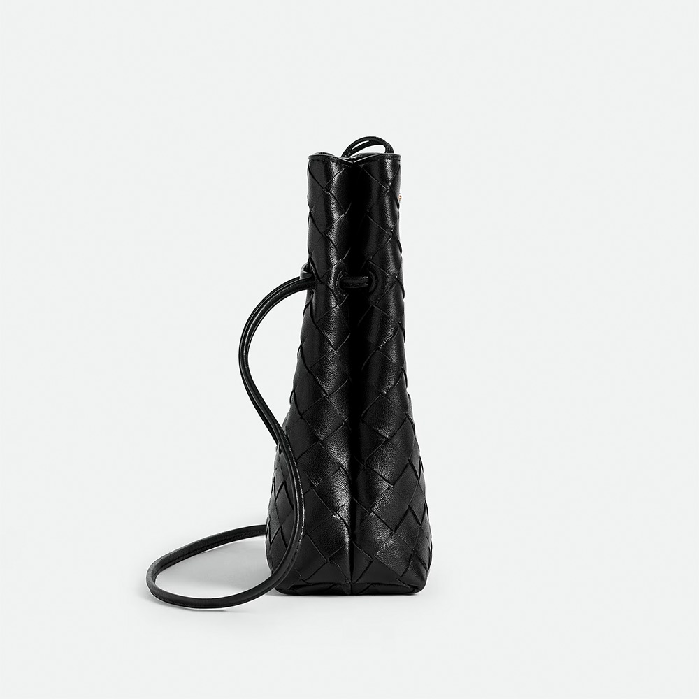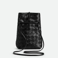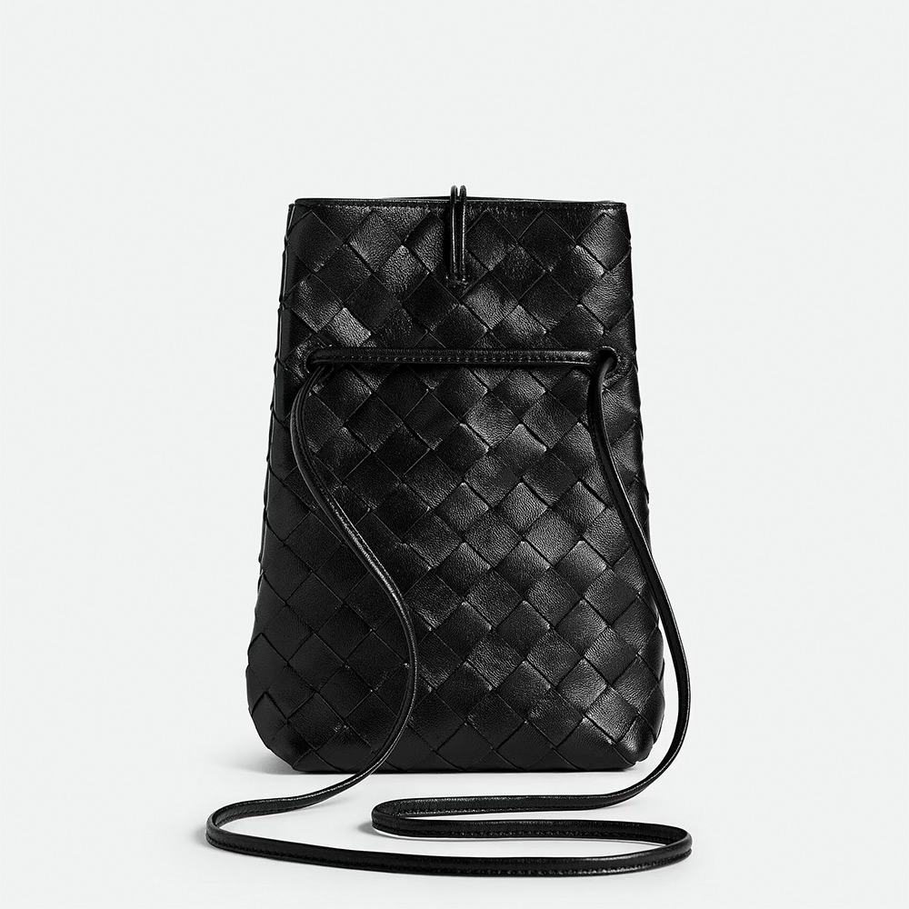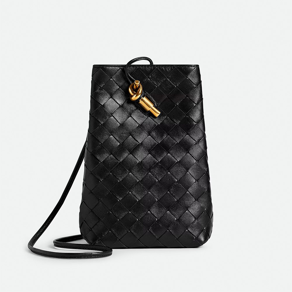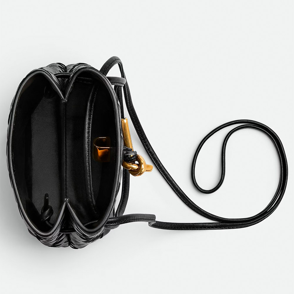 アイコニックなノットクロージャーとスライド式ストラップが付いた、イントレチャートナッパレザーのフォンポーチです。