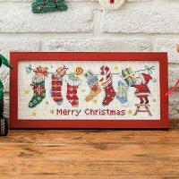 カラフルなソックスにプレゼントを入れている小人のサンタを描いた、クロスステッチフレーム。スパンコールやリボンなどをトッピングしてかわいらしく仕上げます。※画像は商品の出来上がりイメージとなります。