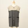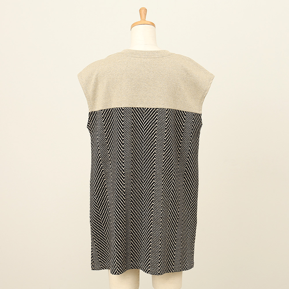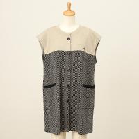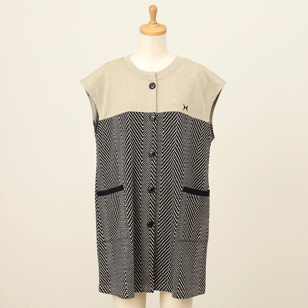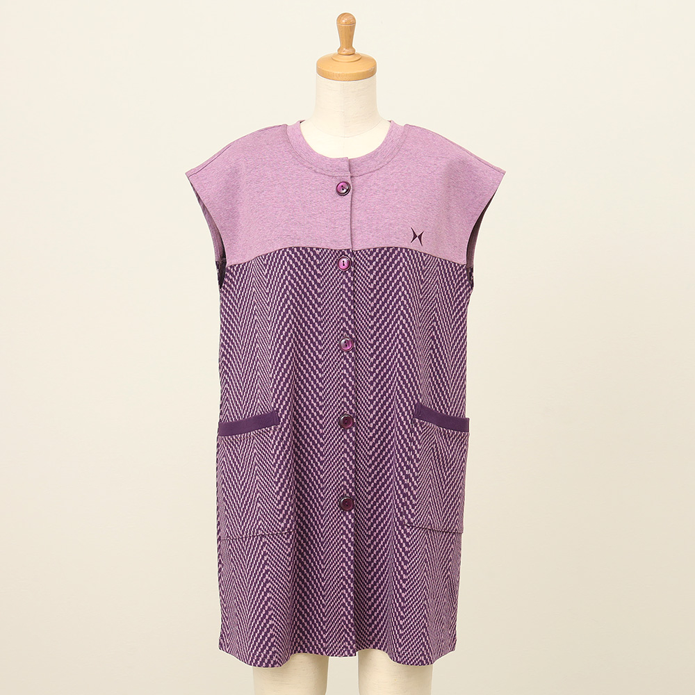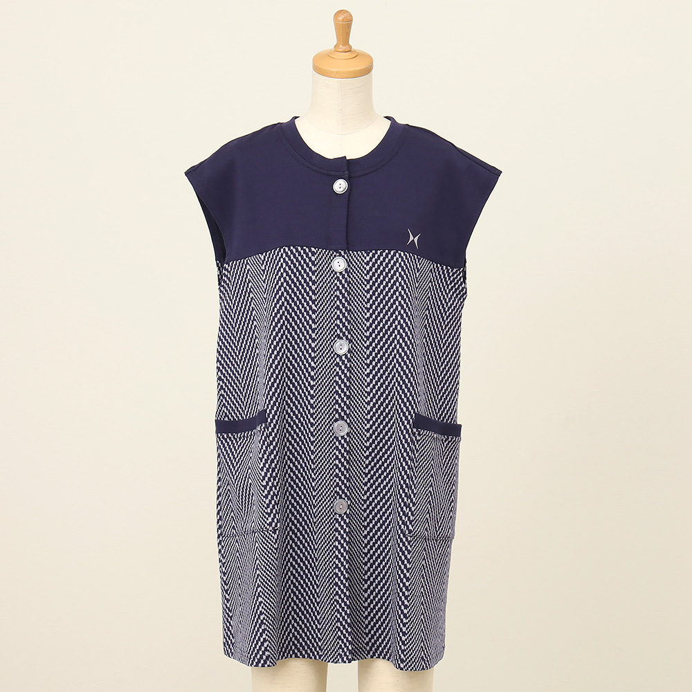 胸元の切り替えがすっきりとした印象のラメ入りニットジャカード素材のエプロン。1日中着用しても疲れにくい、伸縮性のある素材を使用しています。