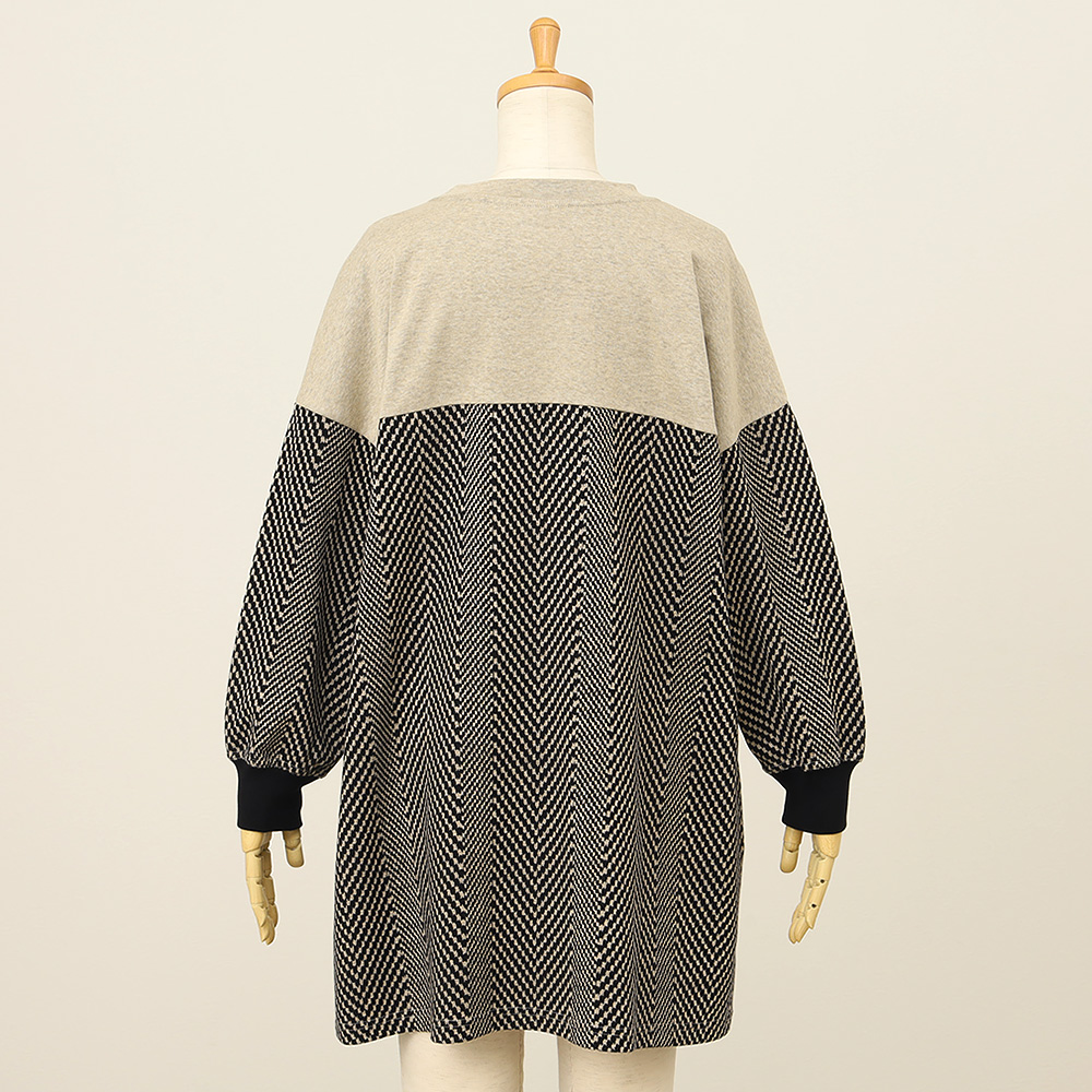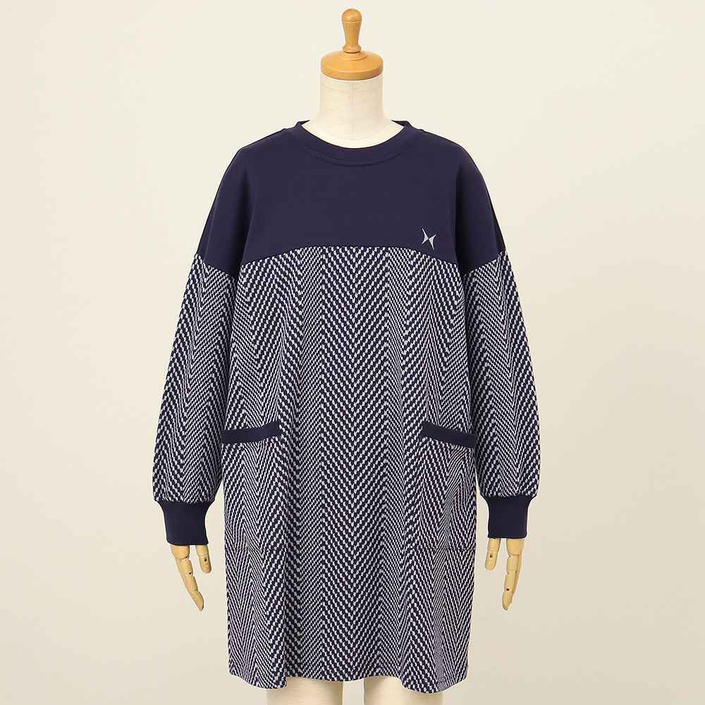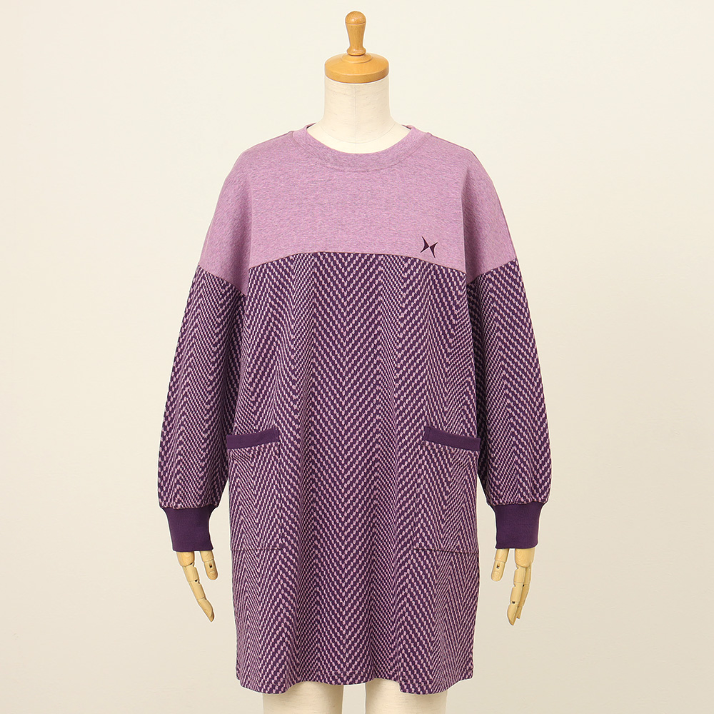 1日中着用しても疲れにくい、伸縮性のあるニット素材を使用したかっぽう着。さりげなく光るラメが上品な印象を与えます。
