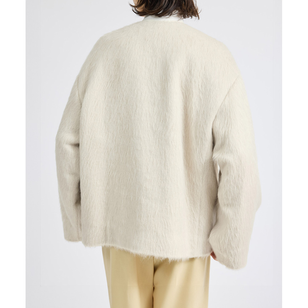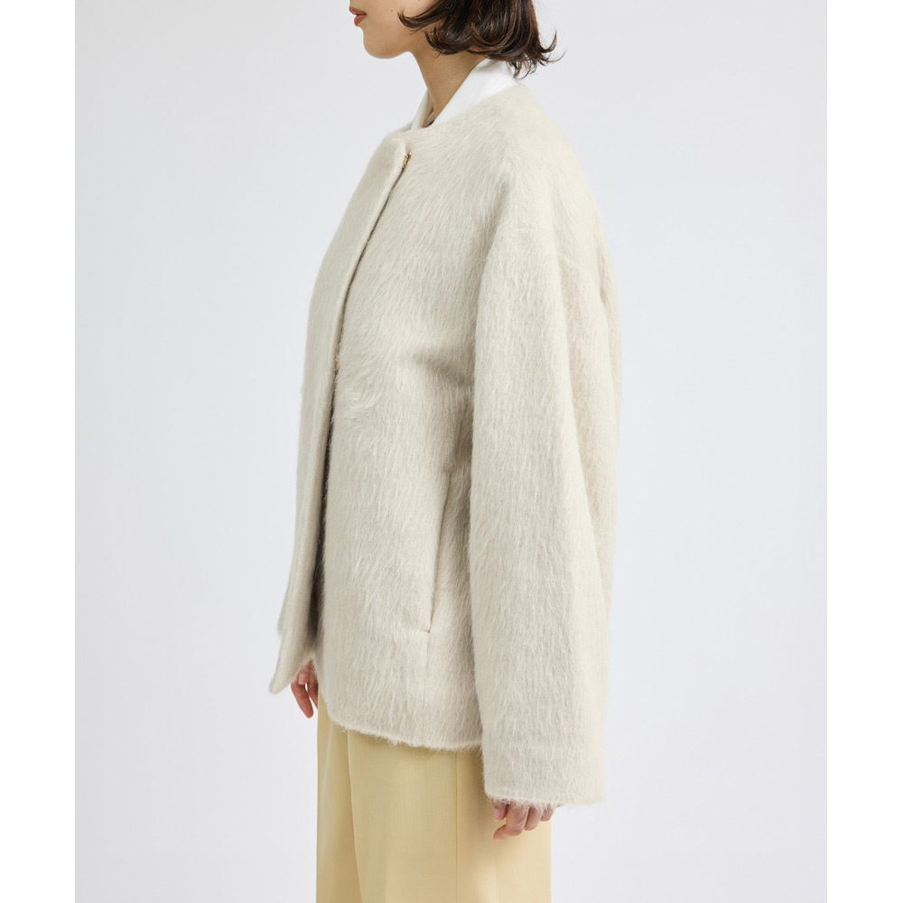 アルパカの中でも希少な原料であるスーリーアルパカを使用。イタリアのブラトー地区のテキスタイルメーカー「Fabrica」(ファブリカ)社の素材です。シンプルなノーカラーでややゆったりしたシルエットのハーフコートです。表から見えないホック留めで、何にでも合わせ易いようシンプルに仕上げています。