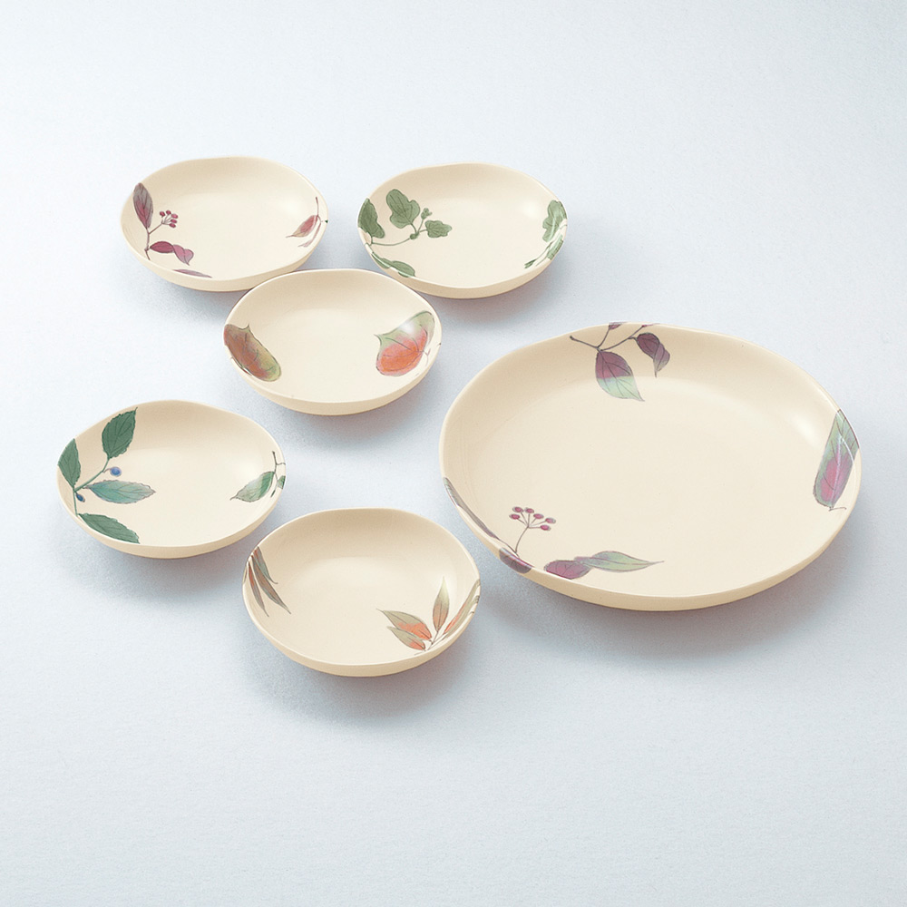 優しい肌合いの生地に映える、水彩画のような樹木絵は、かくれみの・むくのき・やしゃびしゃく・まるばのき・やまももの5種類。多くの色を重ねて微妙な色合いを再現しています。料理の邪魔をしない広い余白は、自然の彩と安らぎをそっと添えてくれます。毎日の食卓で使い勝手の良いサイズのセットです。