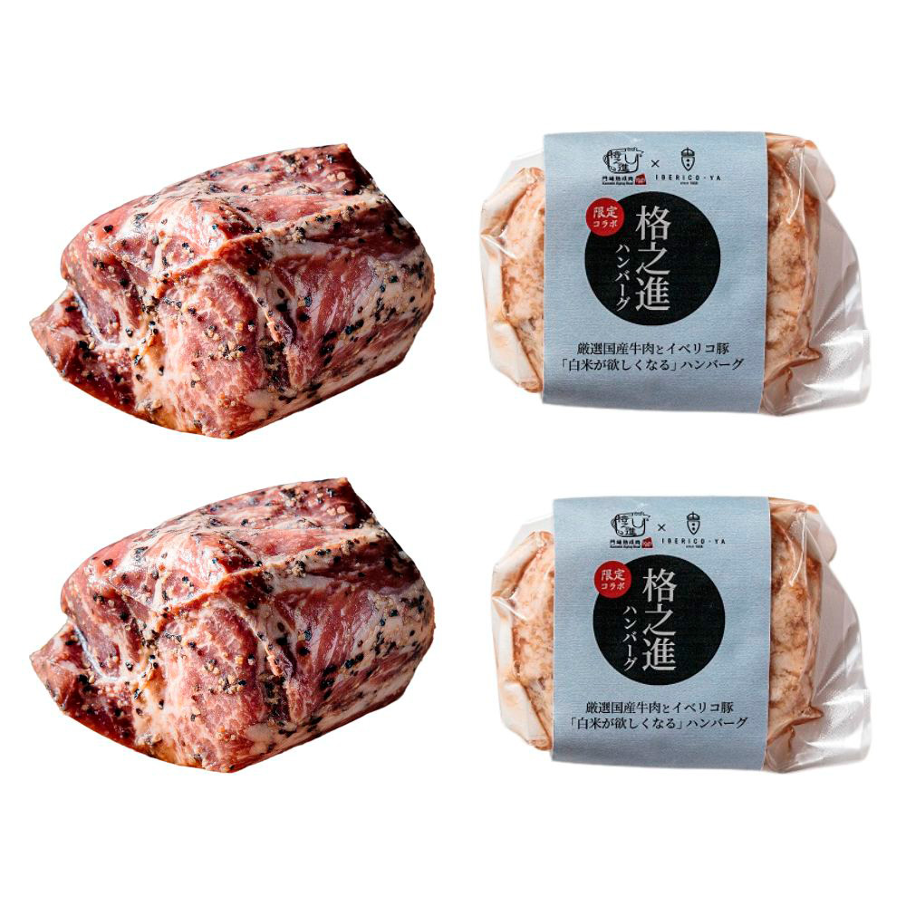 IFFA世界国際ハムコンテスト金賞受賞、イベリコ屋自慢のローストポーク。最高級のイベリコ豚の旨味をしっかりと味わってもらえるように、真空調理という方法で仕上げました。イベリコ屋と格之進がコラボした絶品ハンバーグは、イベリコ豚の脂身と和牛の旨味を絶妙なバランスで仕上げた他にはない1品。今回限りの限定セットです。