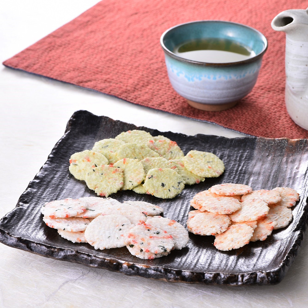 北海道産じゃがいもと九州産さつまいもから作った澱粉を使用したえびせん。わかめ、わさび、ごま味のえびせんを3種類詰め合わせました。パリパリと軽い食感をお楽しみいただけます。