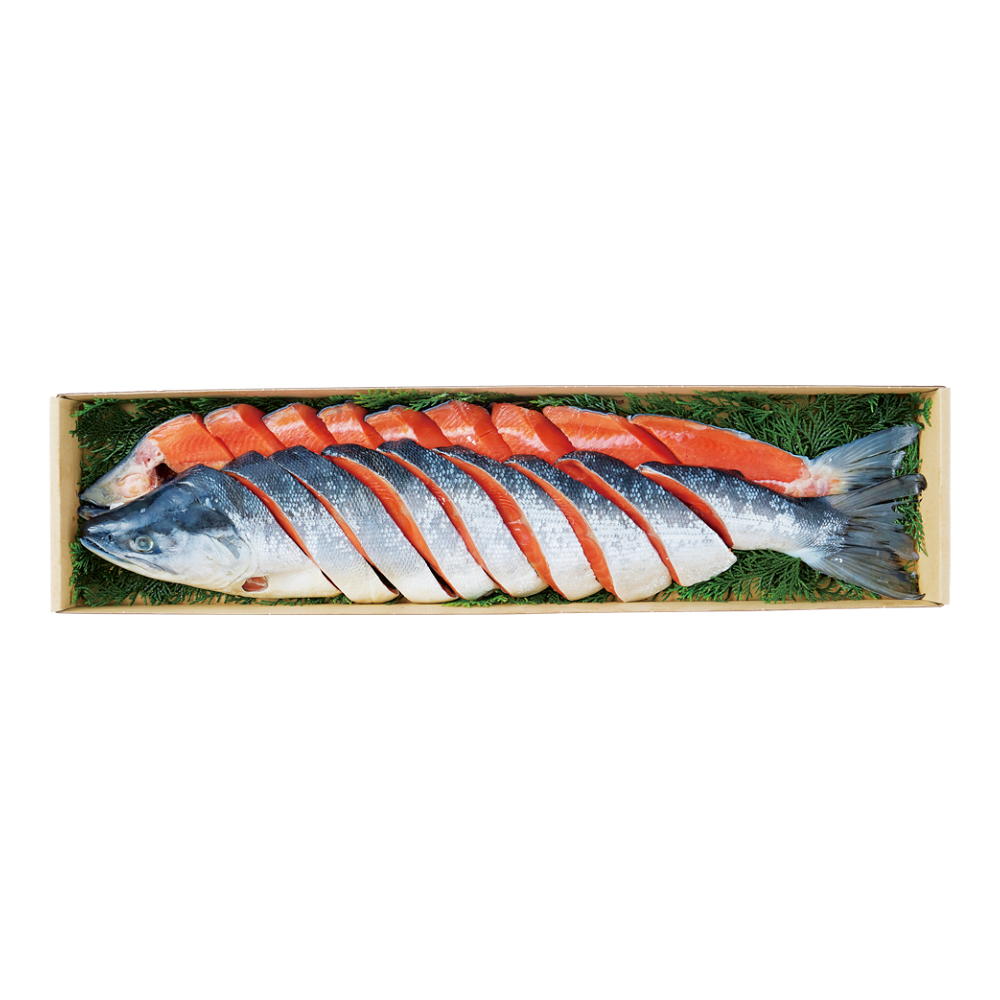 紅鮭1尾1,500g(密封袋入) 原料原産地:紅鮭(ロシア) ※切身にし、4つに分けて包装しております。 ※ヒバは商品に含まれていません。