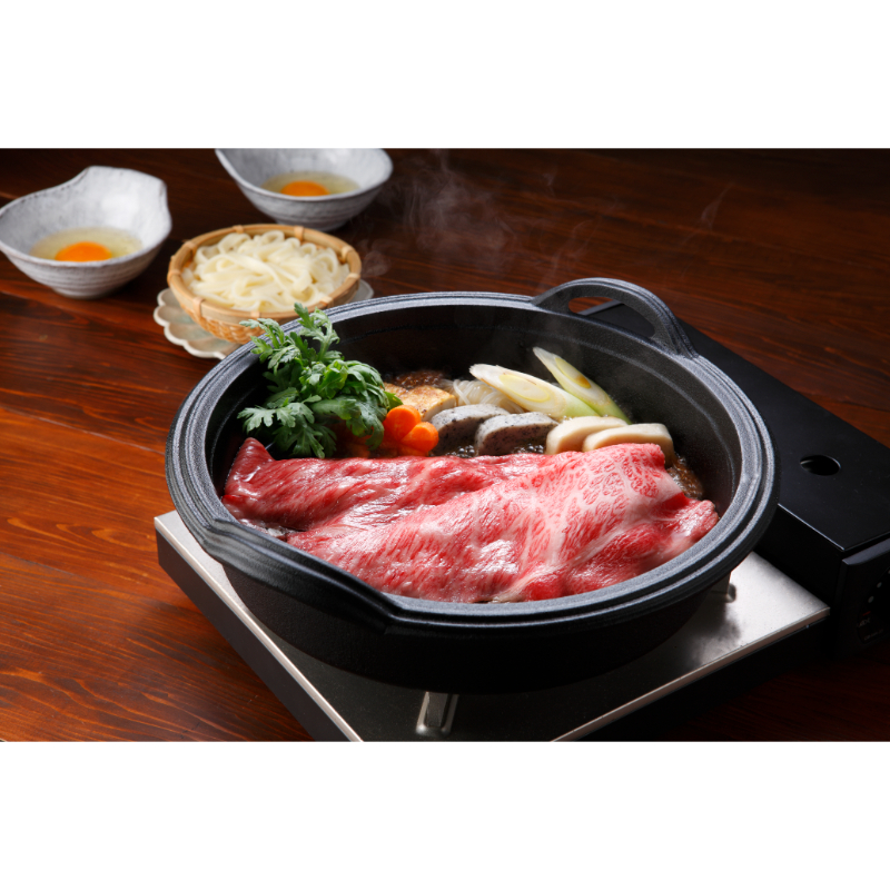 国産黒毛和牛の肩ロース肉とモモ肉をすき焼で。