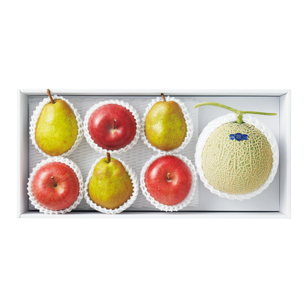 高知県産アールスメロン(青肉)1玉(1.2kg)、山形県産ラ・フランス・青森県産サンふじりんご各3玉(計1.8kg)、計3.0kg