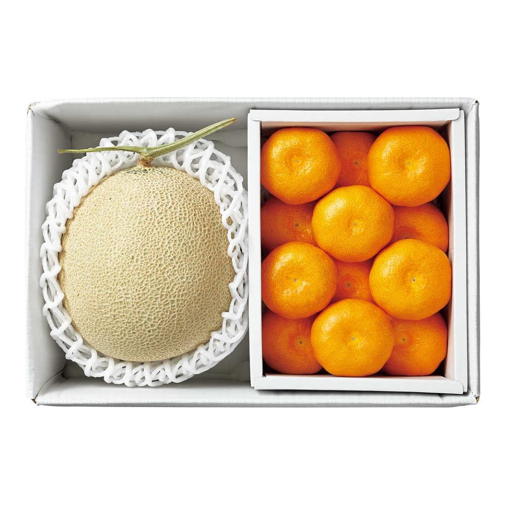 高知県産または熊本県産アールスメロン(青肉)1玉(1.2kg)、和歌山県産みかん12~20個(計1.2kg)、計2.4kg