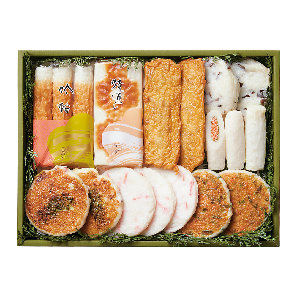 焼通し、竹輪(3本入)、しょうが天・たらこ巻各3、きくらげ天・ねぎ焼・いか焼・はも笹がき天各2