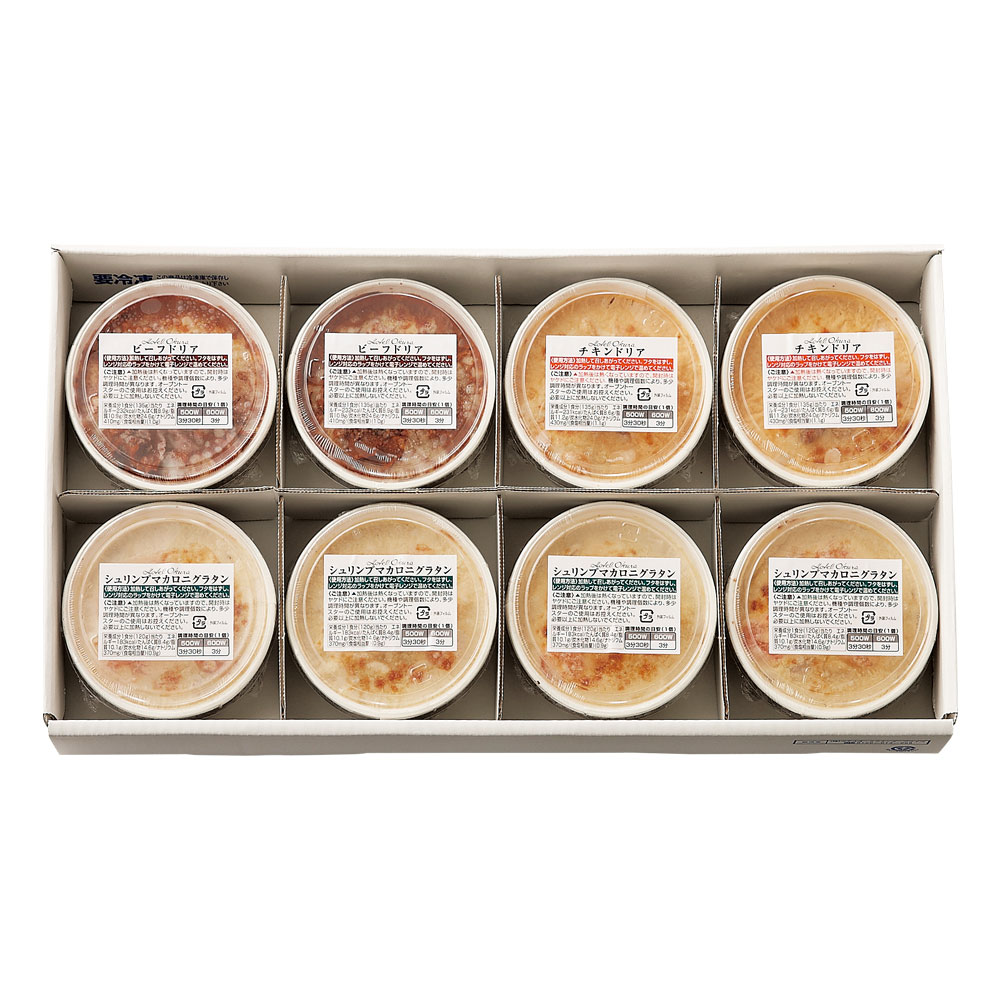 シュリンプマカロニグラタン120g×4個、チキンドリア135g・ビーフドリア135g各2個、3種計8個