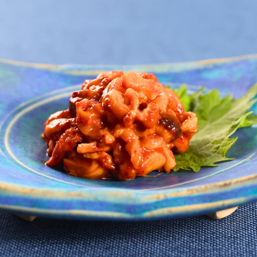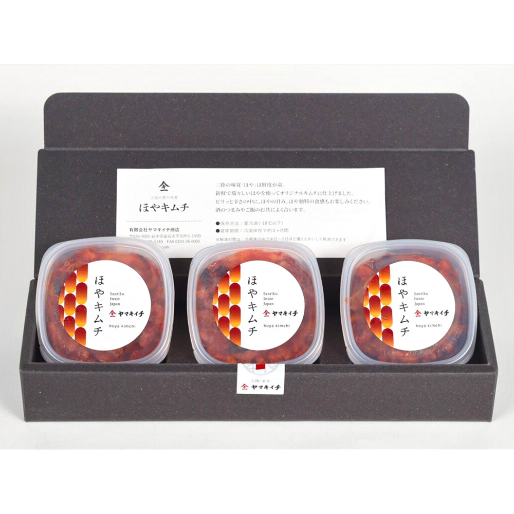 ほやは鮮度が命。生でも食せるほど瑞々しいほやを使い、フレッシュな味わいをそのままに、ほやが苦手な方でもお愉しみいただけるよう、ひと手間かけたオリジナルキムチです。ピリッとした辛さの中に、ほやの甘み、ほや独特の食感もお楽しみいただけます。日本酒やご飯のお供にどうぞ。