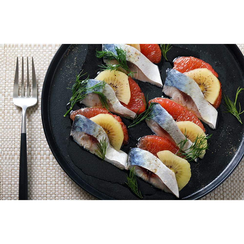 常磐沖(福島県)で漁獲された良質なサバを丁寧に加工したしめ鯖です。隠し味に福島の赤梅「露茜」のエキスを加え、爽やかな味わいに。調味液に梅エキスを配合することで、サバ特有のくせをおさえ、また酢のツンとした酸味をやわらげて、しめ鯖にあまりなじみのない方にも食べやすく仕上げました。加工後は、まぐろを扱う水産メーカーならではの-60℃の超低温冷凍庫で保管し、品質を保持しています。