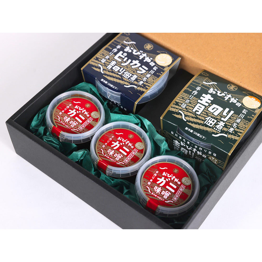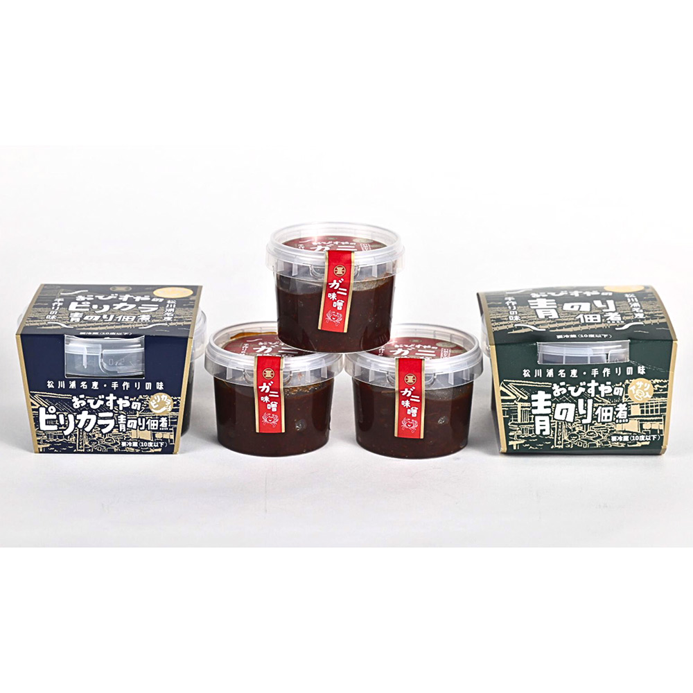 おびすやの青のり佃煮アサリ入180g×1、おびすやのピリカラ青のり佃煮180g×1、おびすやのガニ味噌100g×3個