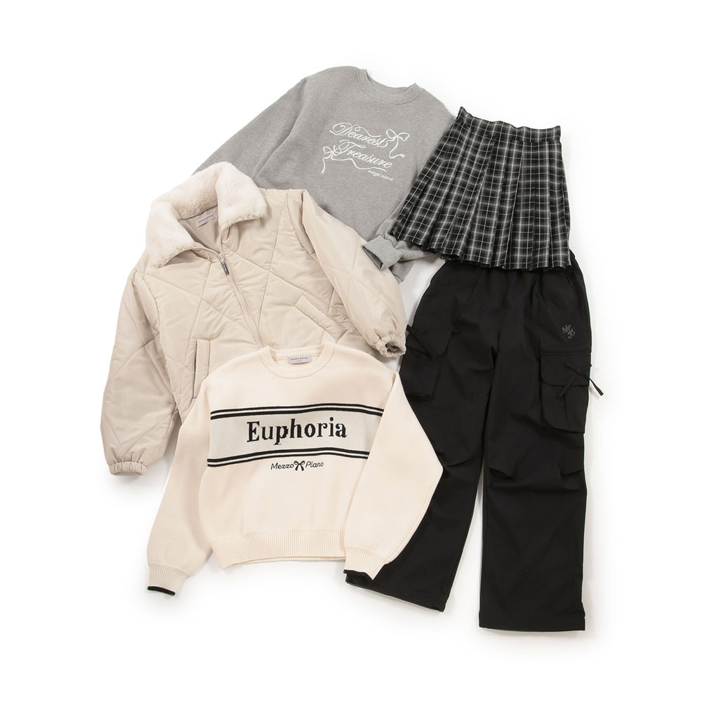 ふんわりとしたボリューム感のあるフェイクファー襟付き中わたジャケットは、軽やかな着心地ながらあたたかく、デイリーにもお出かけにもぴったりの万能アウター。トップスには、大きめロゴが印象的なジャカードニットと、裏起毛トレーナーをご用意。どちらもトレンド感と着心地の良さを兼ね備えています。ボトムは、モノトーンチェックのプリーツスカパンでスクールガール風に、スポガーリーな雰囲気の2WAYカーゴパンツでカジュアルガーリーに、と気分に合わせて幅広い着こなしを楽しめます。毎日のコーディネートがぐっと楽しくなる、バリエーション豊かな福袋です。