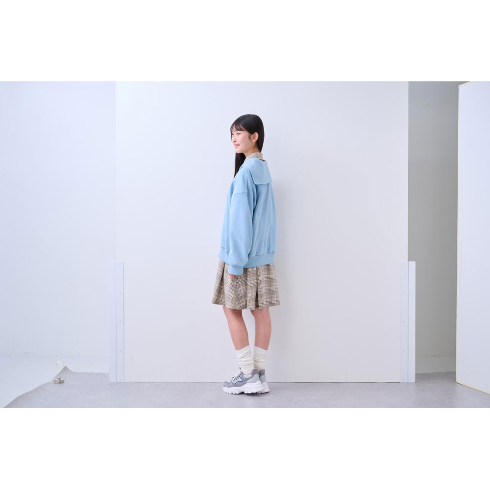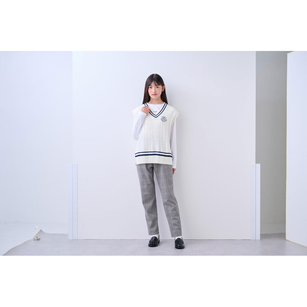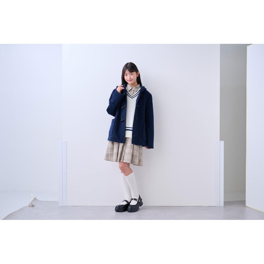 通学にぴったりなネイビーのダッフルコートは、落ち着いた色味で制服にも私服にも合わせやすい一着。裏起毛のハーフジップトレーナーは、寒い季節にうれしいあたたかい着心地です。ライン入りのニットベストとチェックワンピースのセットは、きちんと感もあり、学校でも休日のお出かけにも活躍します。グレンチェックのテーパードパンツは、動きやすいアイテム。スムース素材のロゴTシャツは、肌触りが良く、インナーにも1枚でも使いやすい万能トップスです。ニットベストと合わせても可愛くお召しいただけます。