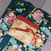 振袖:グリーン、帯:白×金、長襦袢:ピンク、重ね衿:黄色、帯揚げ:赤、帯締め:赤