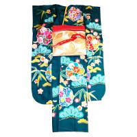 人気の青みがかった濃いグリーン地に松竹梅の吉祥柄の振袖。明るいゴールドの帯に、イエロー系の重ね衿、帯締め・帯揚げは華やかな赤をコーディネートしました。