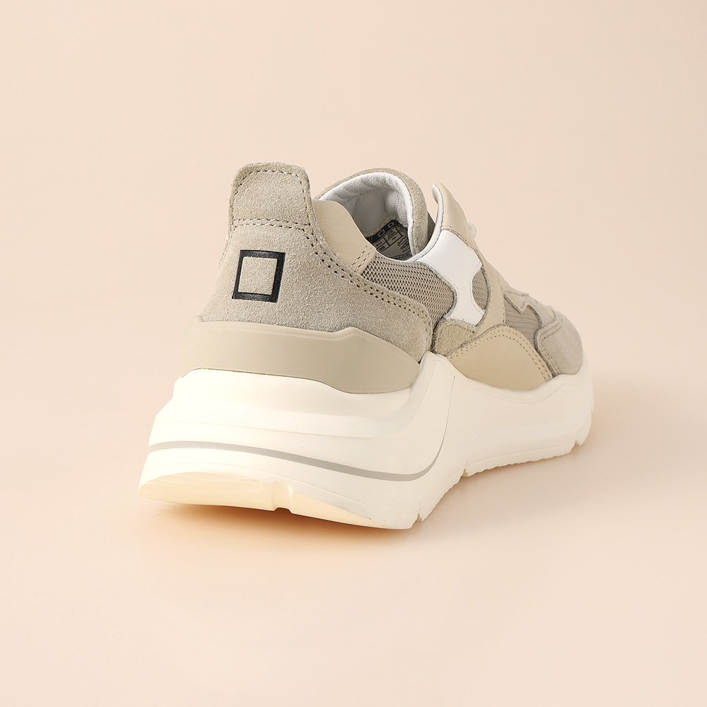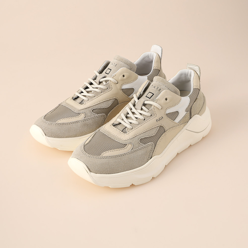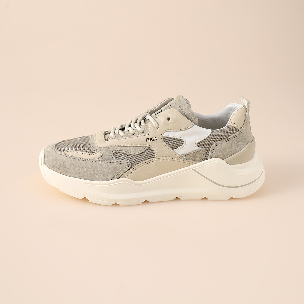 D.A.T.E.の代表的アイテム<FUGA>。配色にこだわった目を引くデザインと履きやすさが両立するダッドスニーカー。カジュアルになりがちなスニーカーですがレザー使いが得意で上品に履きこなせる一足です。