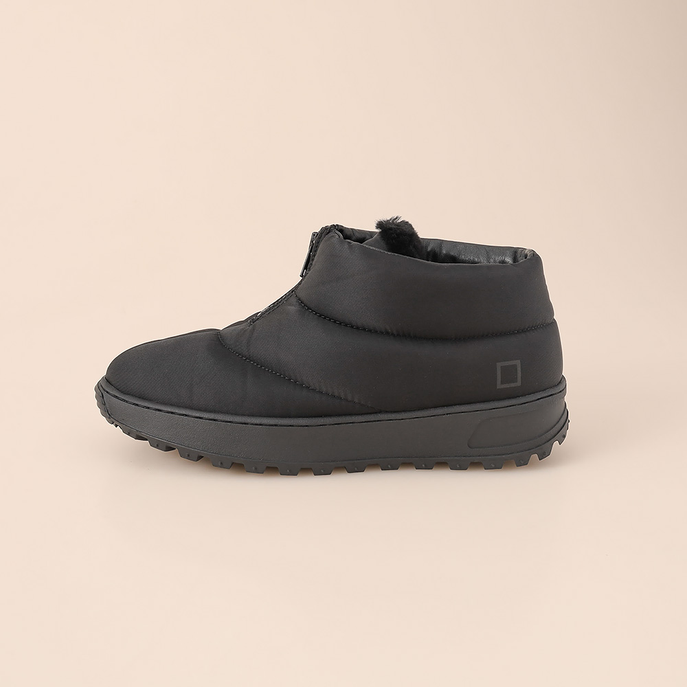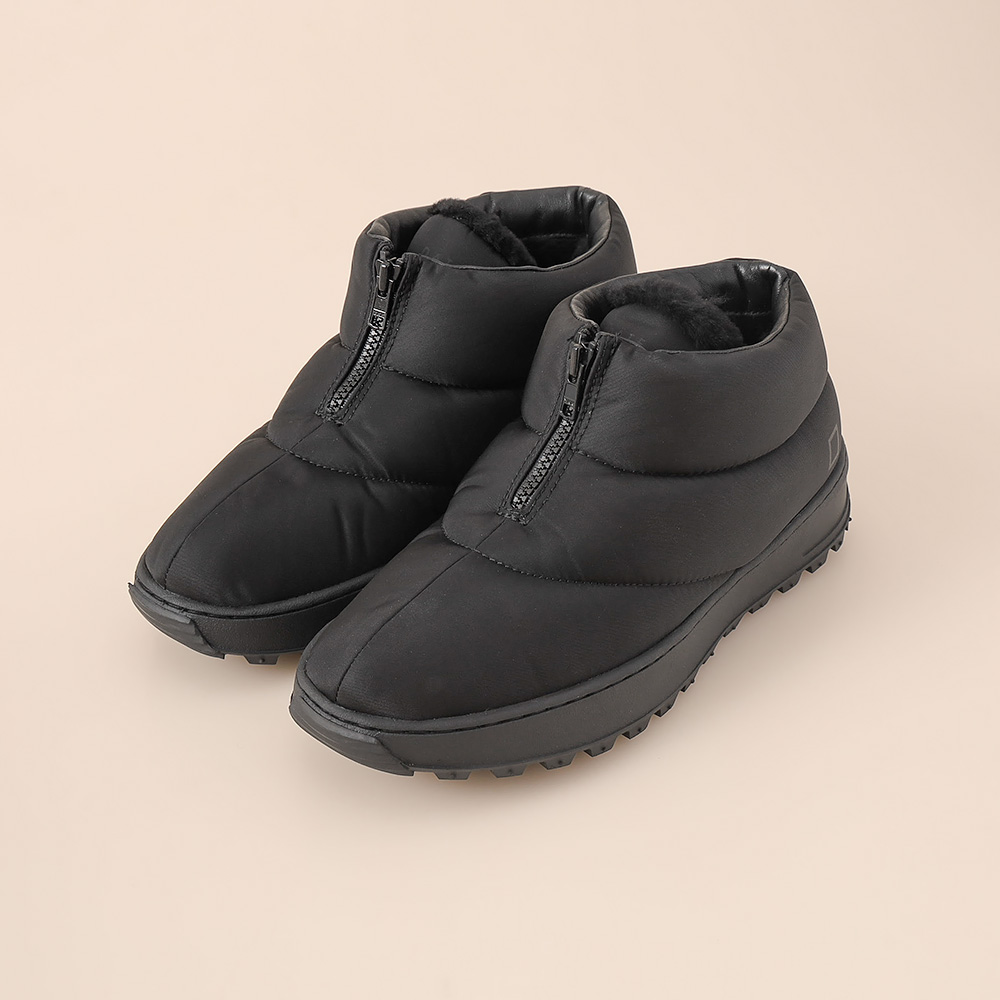 センタージップで着脱しやすいショートブーツ。アッパーのナイロン地は撥水加工を施しています。(※完全防水ではございません)インソールとライニングにはリアルファーを採用し、寒い日も暖かく過ごせます。