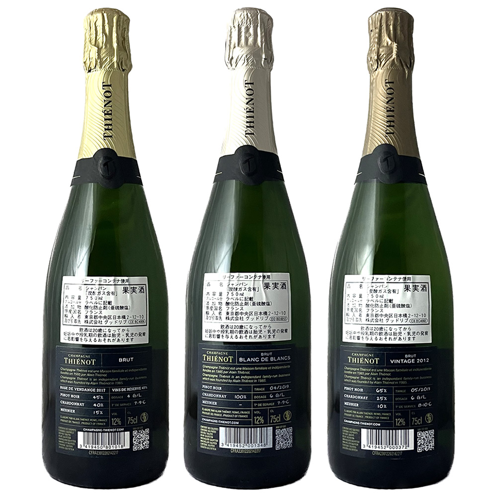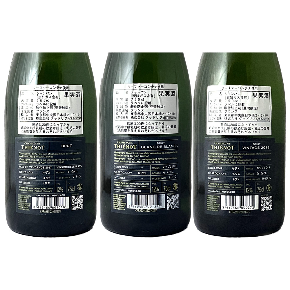 シャンパーニュ ティエノー キュヴェ ブリュットNV、キュヴェ ブラン ド ブランNV、キュヴェ ヴィンテージ 2012