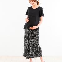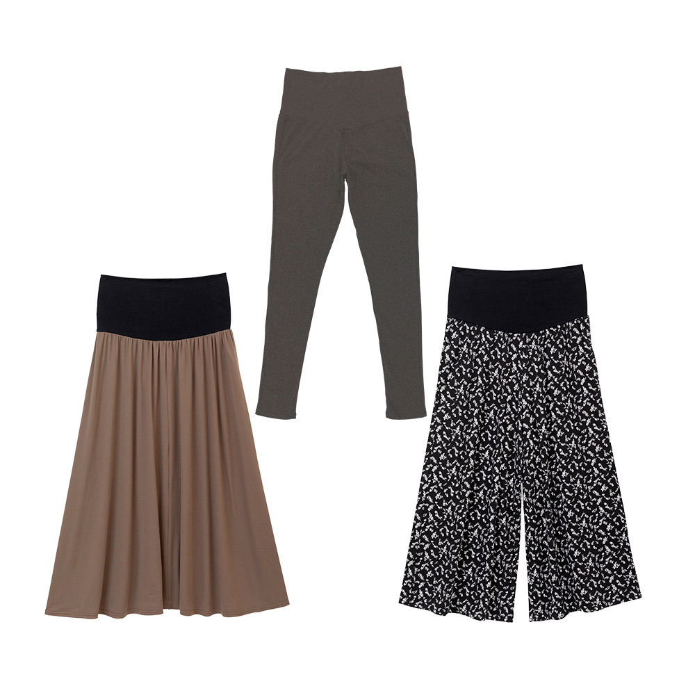 サイズ調整ができて生地も伸びるので、妊娠初期~後期はもちろん、産後も一般の婦人服として着用できます。10分丈パンツは綿リッチな生地なのではき心地が快適。ガウチョパンツはゆったりとしたシルエットで、リラックスした印象の着こなしに。マキシスカートは脚のラインをカバーしてくれて、見た目もスタイリッシュ。