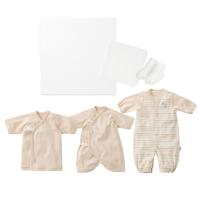 短肌着、コンビ肌着、ドレス&カバーオール、正方形バスタオル、ガーゼハンカチ、ソックスの6点入り。出産準備で揃えておきたいアイテムがたくさん入っています。正方形バスタオル、ガーゼハンカチは綿100%です。