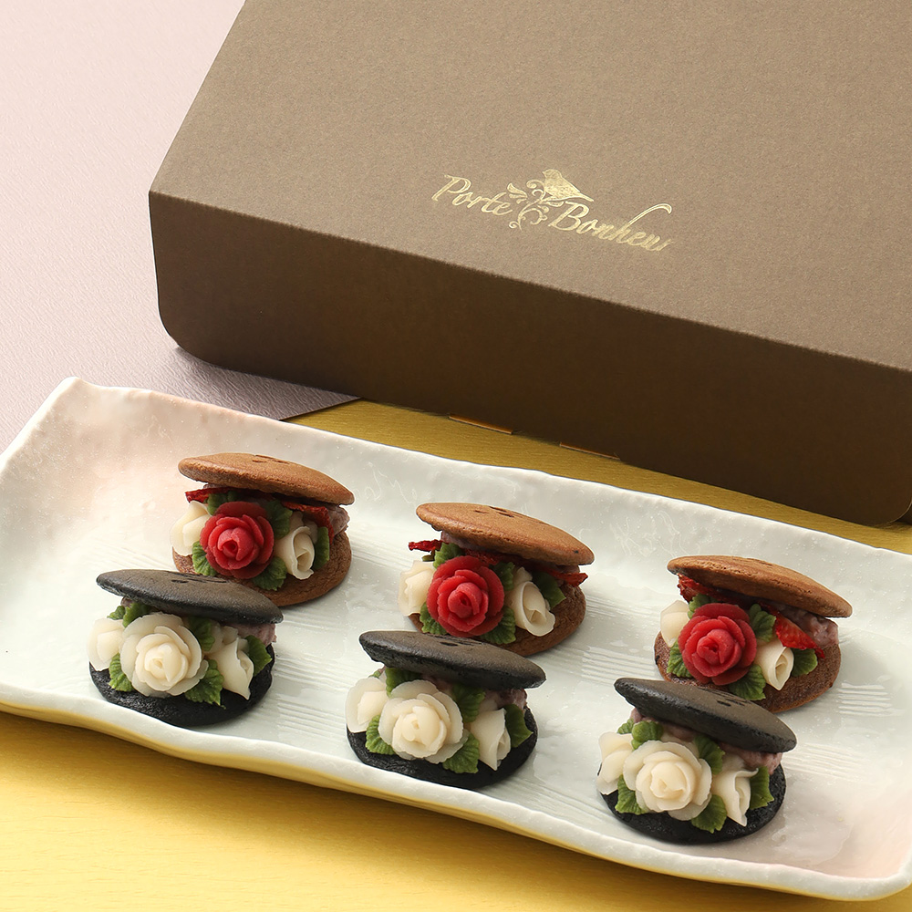 全てを手作りにこだわり、職人が一輪一輪白餡を手絞りで「華」をリアルに表現しています。白餡(花)の奥には黒餡とマスカルポーネチーズのブレンド餡があり、更にブレンド餡の中にはローストアーモンドダイスを入れる事で和菓子と洋菓子の融合を感じる事が出来ます。花の色は九州産の天然素材(野菜や果物)を使い着色。同梱された食べ方により、和菓子と洋菓子の融合を感じる事が出来る。さらに、今回は魅惑の黒をテーマにしたスペシャルBOXをご用意いたしました。