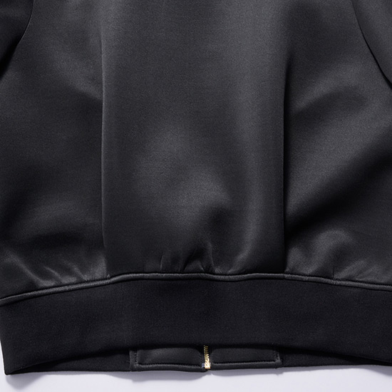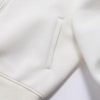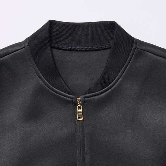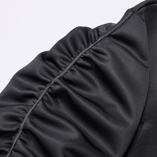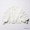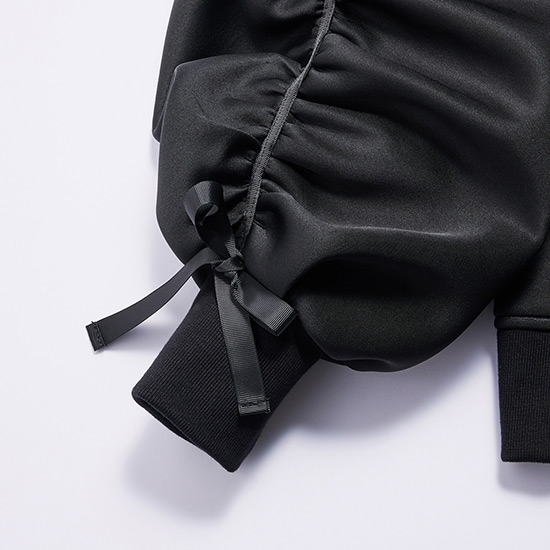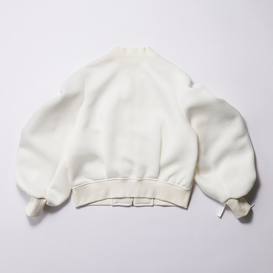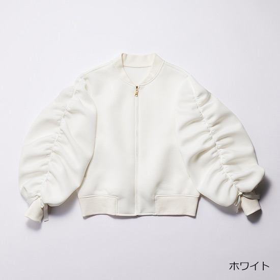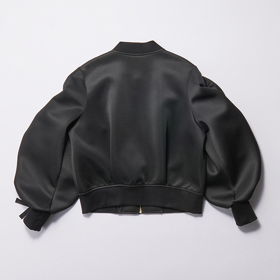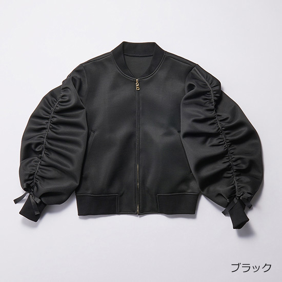もちもちのボンディング素材を使用した、バサッと羽織れるイージーさが魅力のブルゾン。メンズライクなアイテムを、ふんわりギャザー袖やグログランリボンで甘辛MIXに。あえて体が泳ぐゆったりめのシルエットもレディライクな着こなしにおすすめ。軽量でお家で洗えるから、子どもとの公園アウターにも活躍。カジュアルコーデはもちろん、高級感のある微光沢素材はスカートスタイルとも相性良し。オーバーサイズなので、冬場はインナーを着込むことも可能。もちもちでストレッチ感もある生地なので、子どもと思いっ切り遊ぶときでも楽ちん。
