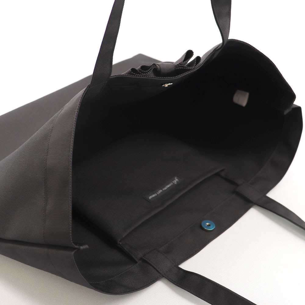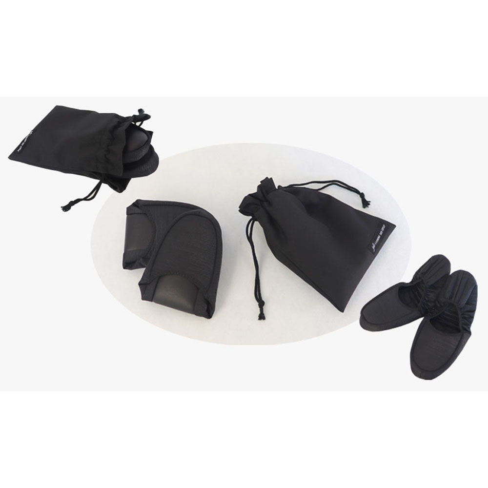 フォーマルシーンから普段使いまで便利にご使用いただけるブラックカラーの軽量サブバッグです。サブバッグは折り畳んでコンパクトに携帯することもできます。可愛らしいダブルリボン付き。ルームシューズ型の携帯スリッパは光沢のない黒のグログラン素材を使用しています。コンパクトサイズになるので旅行時やお子様の学校訪問時などにお勧めです。黒の巾着袋はお着換え入れ、小物入れ、外靴入れなどマルチにお使いいただけます。