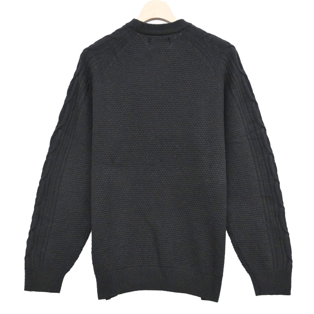 ウール70%ナイロン30%で混紡された素材を使用したクルーネックセーター。ウールの特性として防汚性と防水性そしてメンテナンス性に優れておりますが摩擦には弱い性質があります。ナイロンを混紡することで耐久性と軽さも同時に備えることができました。それぞれの素材の特性をいかしたアイテムです。袖にアラン編みを取り入れたデザインがアクセントに。