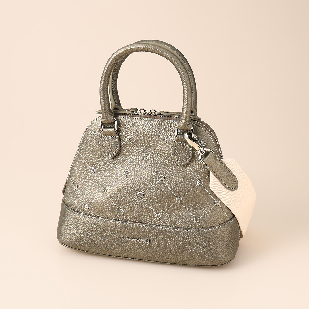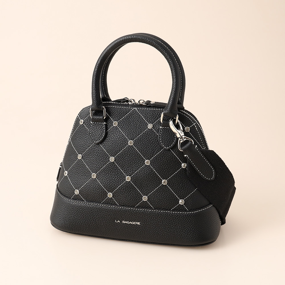 人気の高いシルエットをベースに、クロスステッチをきかせ、交差している箇所にラインストーンリベットを取り付けたアイコニックな仕上がりです。ボトムス部分を無地にすることで、程良く上品なムードに。一見コンパクトですが、台形型で底に向かって広がっており、マチ幅もあるので長財布などがしっかりと収納できるサイズです。見た目以上に収納力が高く、さらにメインのファスナーは2個使いになっており、左右どちらからもひらく事が可能な仕様に。開口部が大きく開き、持ち物の出し入れがスムーズに行えるのも嬉しいポイントです。使用しているのはシュリンクタイプの牛革なので、キズが目立ちにくく味が出る、経年変化を楽しんでいただける素材です。直置きしても汚れがつきにくいように、底鋲が4つついています。取り外しができる2wayショルダーは敢えてワイドなものを合わせることで上品になりすぎず、ほど良くカジュアルダウンしてお使いいただけます。