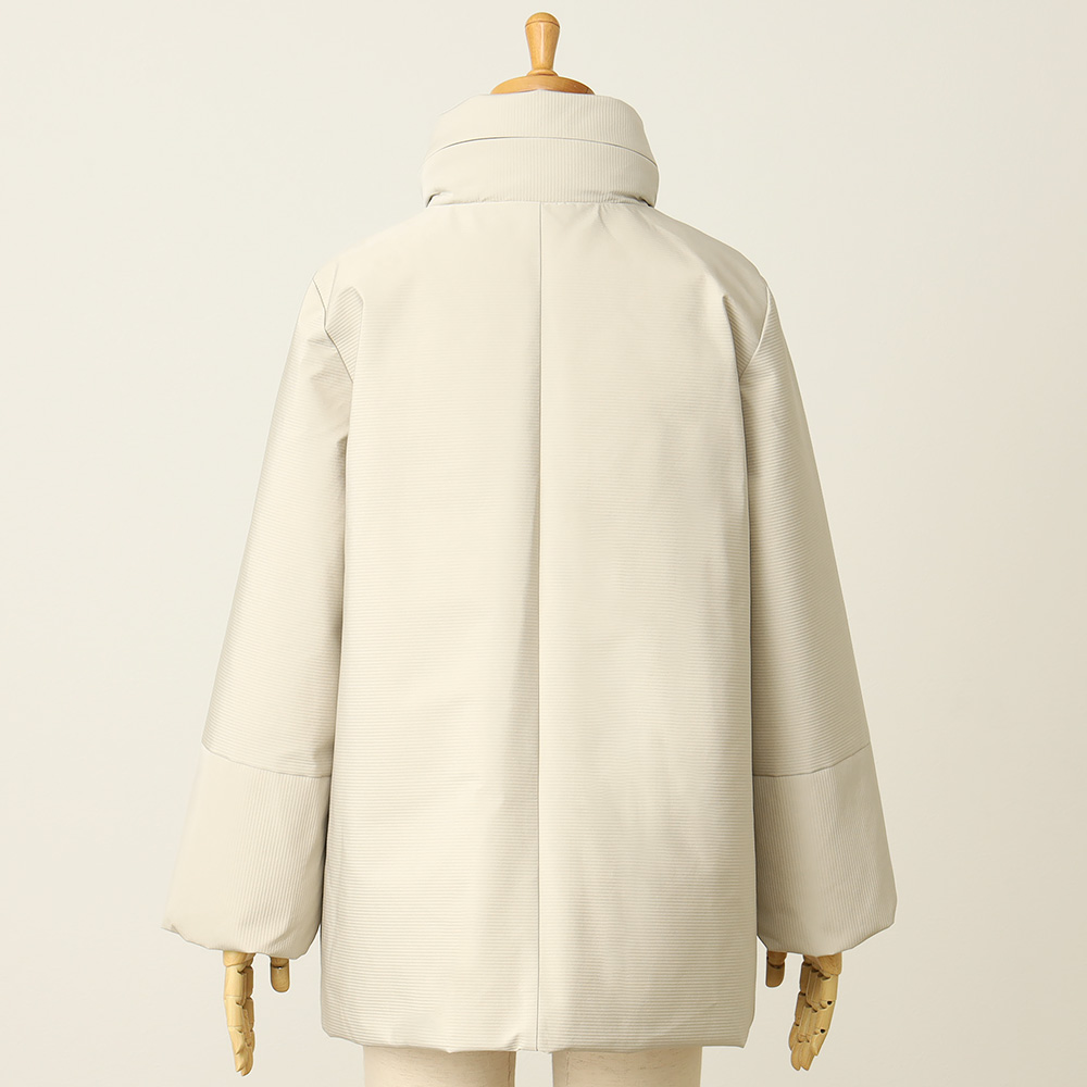 オーストラリア・ヴィクトリア州の豊かな自然の中で育てられた水鳥から採れる「ヴィクトリアダウン」を使用。純白でかさ高があり、保温性に優れた高品質なダウンで、寒い季節も快適に過ごせます。表地には、立体感と高級感が際立つ「ボーダージャカード素材」を使用。織りによって柄を表現するジャカードは、プリントにはない深みと厚みがあり、上品な印象を与えてくれます。冷たい風をしっかりと遮りながら、軽やかな着心地を実現。