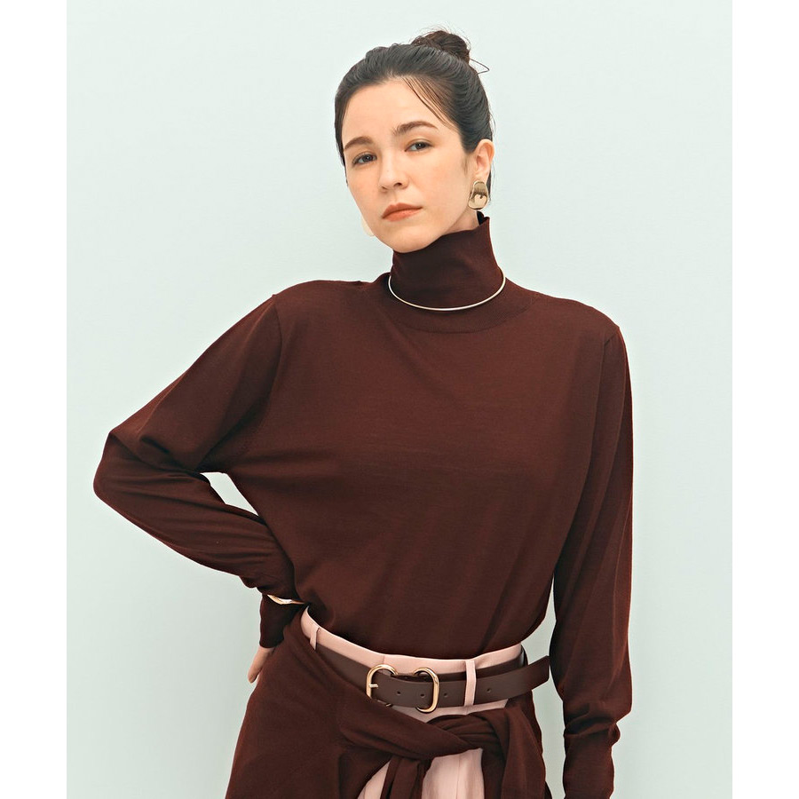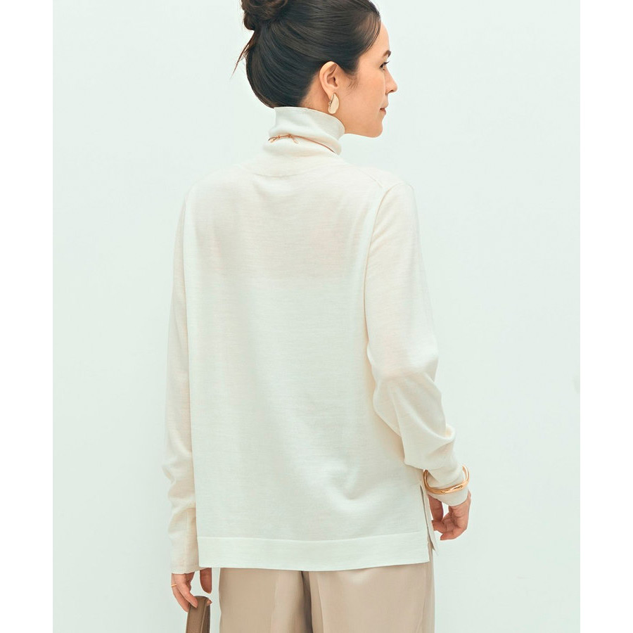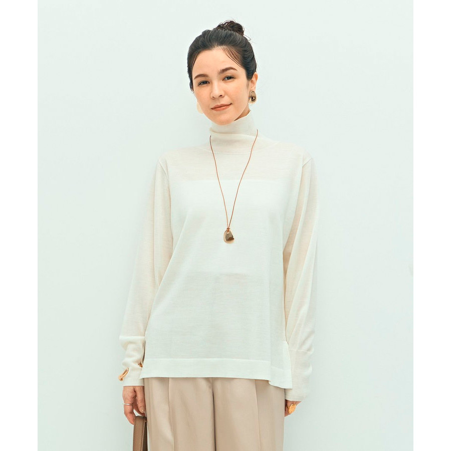 ハイゲージの18ゲージ仕様のニット。きれいな目面としっかりした編地が型崩れを防止。18ゲージで白でも透け感が軽減。肌触りのいい柔らかさと程よいコシを兼ね備えた、ナチュラルな光沢のある高感度のウール素材を使用。デザイン性と実用性を両立したニット素材。毛玉になりにくいアンチピリング、手洗い可能なのが魅力。ドレープ感があり、ボデイラインを拾わない絶妙なサイズ感がポイント。ベーシックなデザインで着回しが効き、様々なコーディネートに活躍する万能アイテム。同素材のVネックカーディガンとアンサンブル着用も可能。