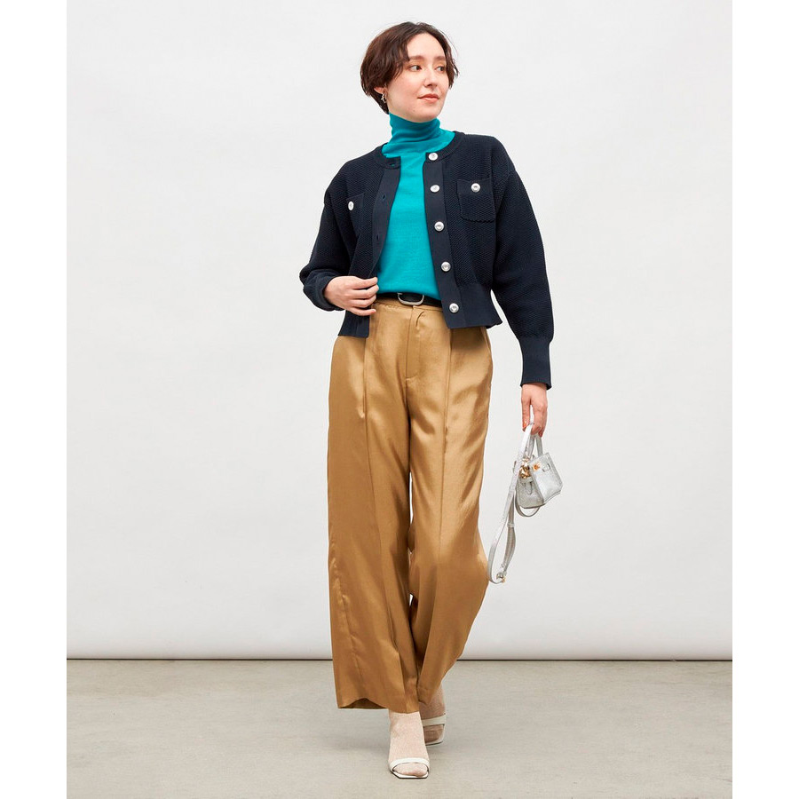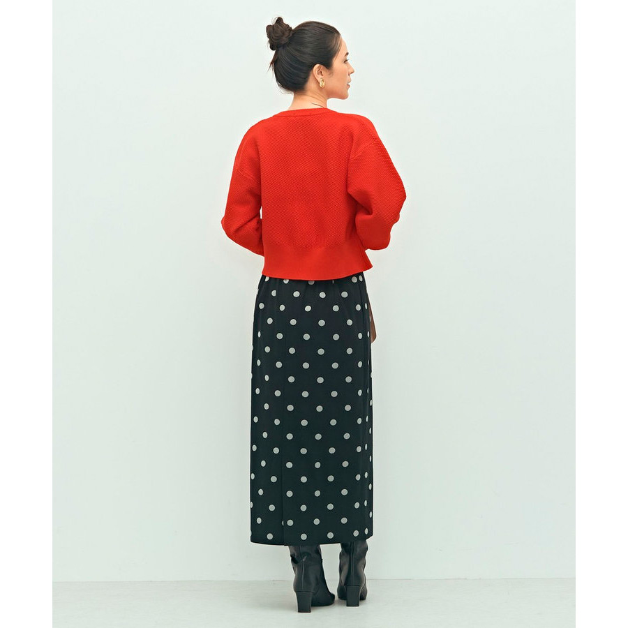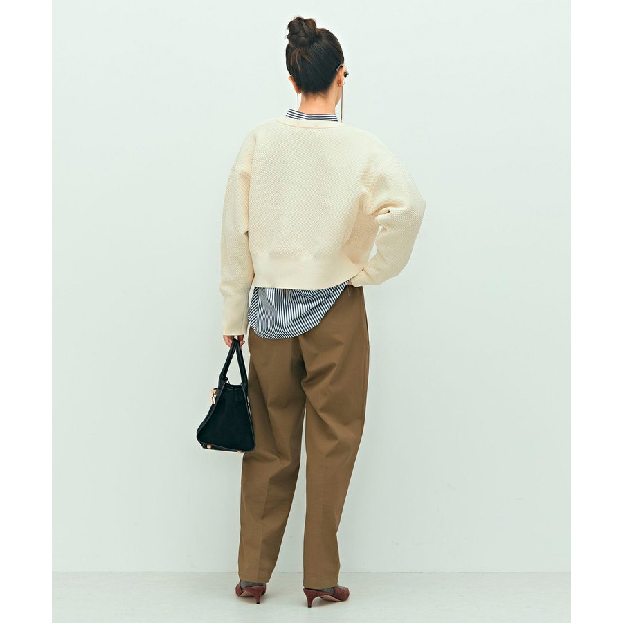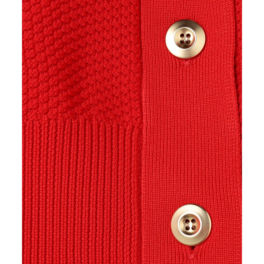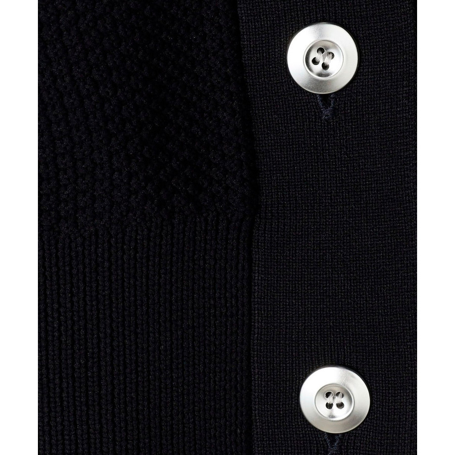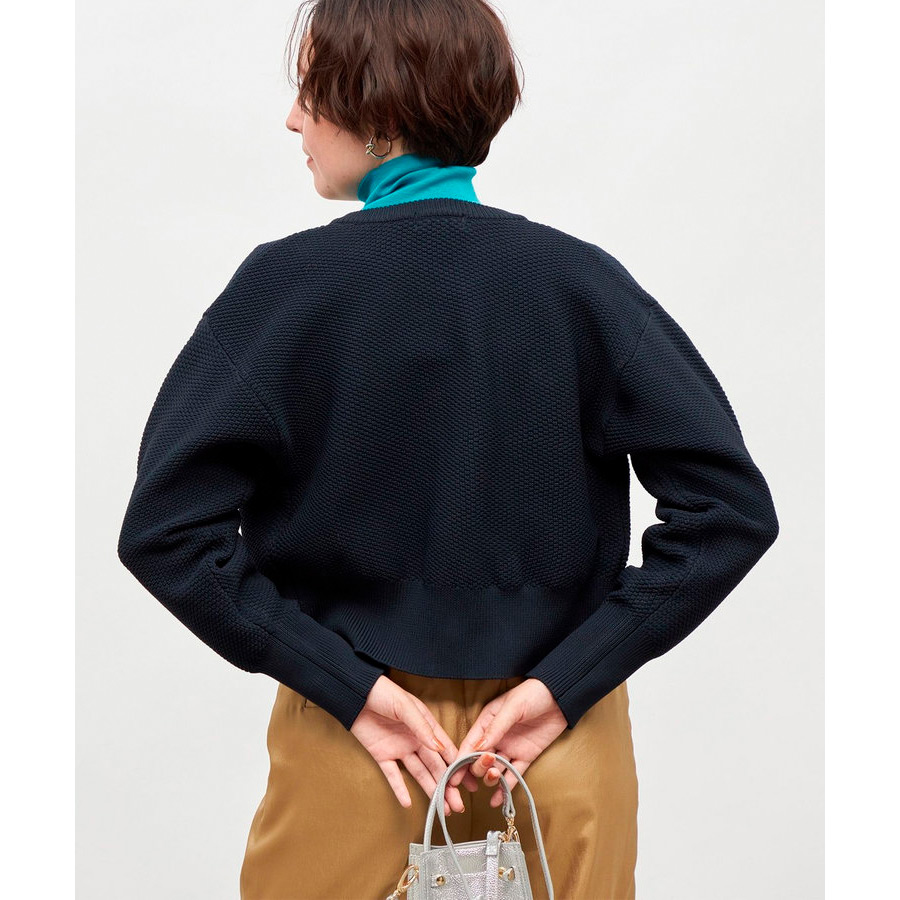 ポリエステル素材の鹿の子編み。ドロップショルダーでゆっためのサイジングながら、袖口と裾のリブ幅を長めにすることで、コンパクトですっきりめに。どんなボトムともバランスが取りやすいシルエット。前を閉じて、プルオーバーとし手の着用もおすすめ。きれいめスタイルに合わせたり、パンツスタイルにラフに羽織ったり、色々なスタイルを楽しめる万能アイテム。