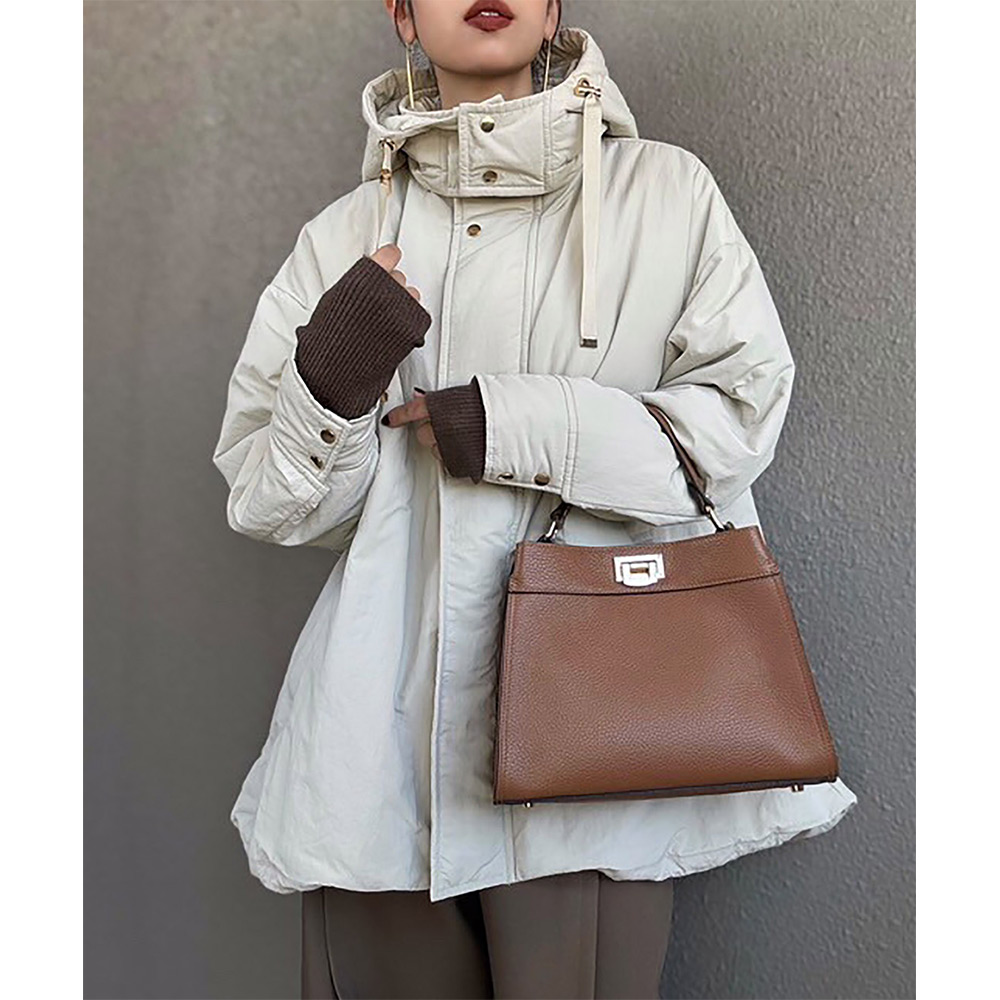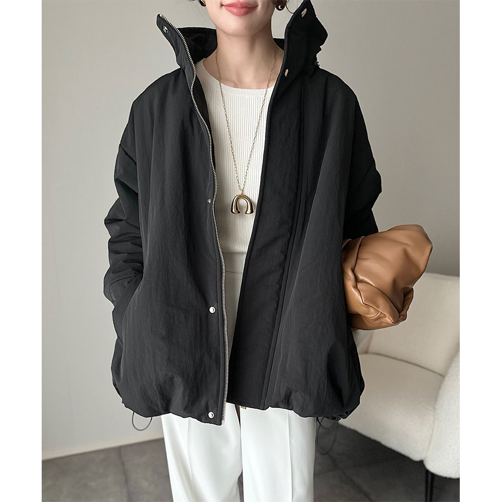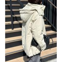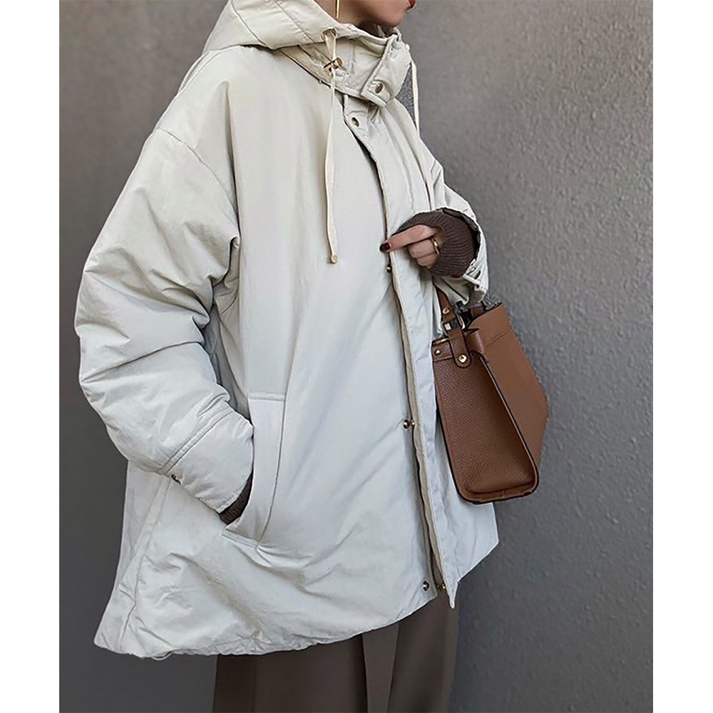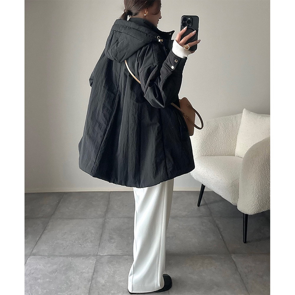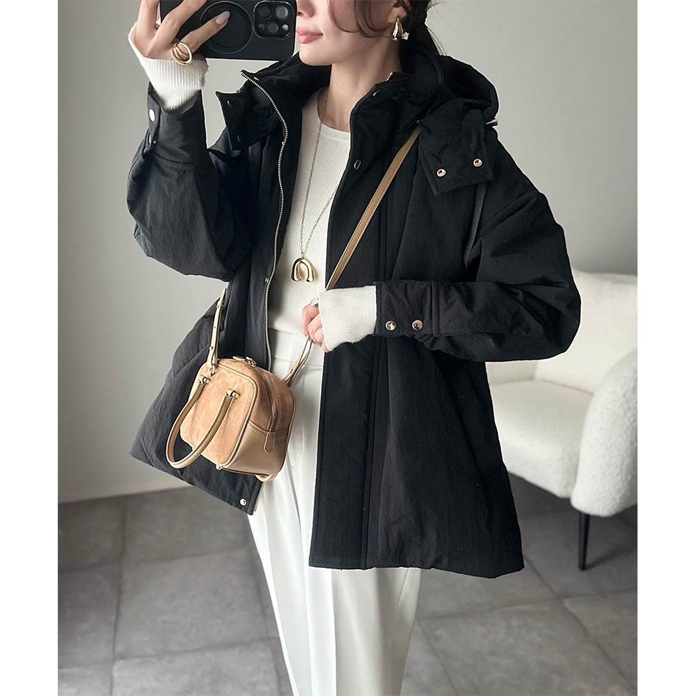 お尻が隠れる着丈で安心感のある中綿コートは身幅も腕回りもゆったりしているので、スウェットやニットなどを着てもごわつかずに着用していただけます。裾にはゴムドロスト内蔵なので、絞るとコクーンシルエットになります。フードは取り外し可能なので、シンプルでモダンなスタンドカラーにもなります。流行り廃りのないデザインは息の長いアイテムです。