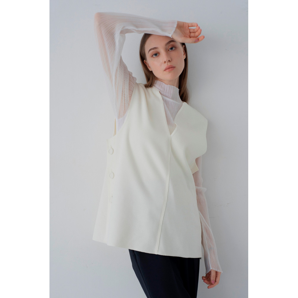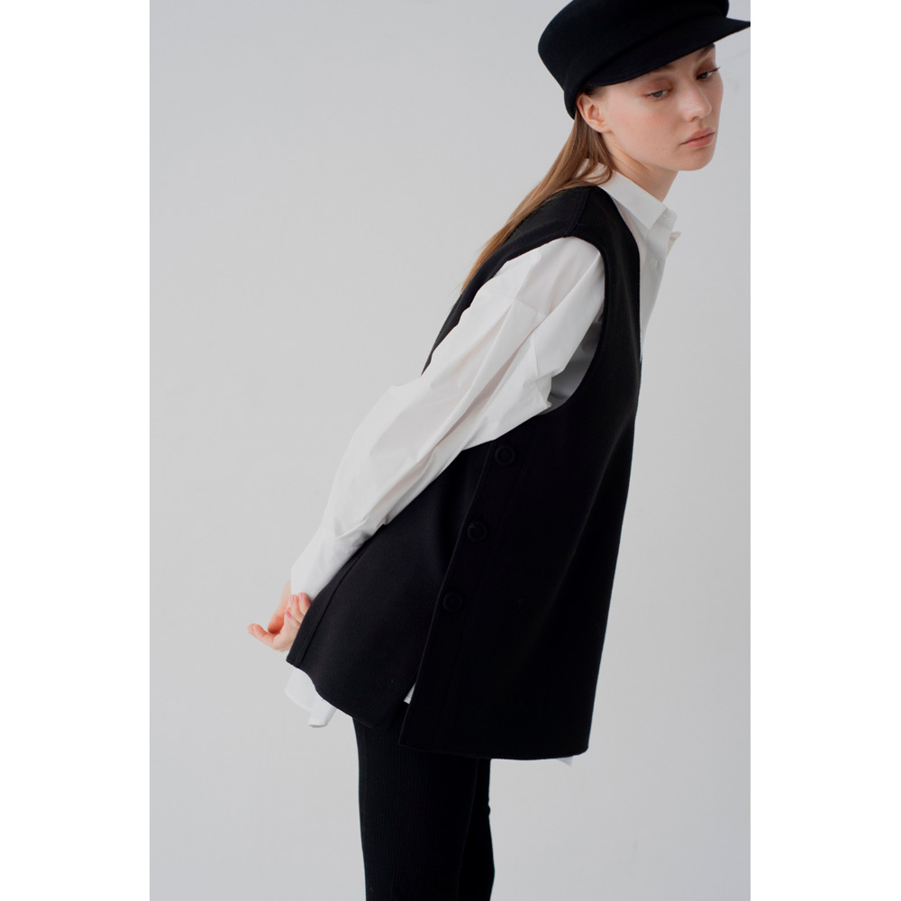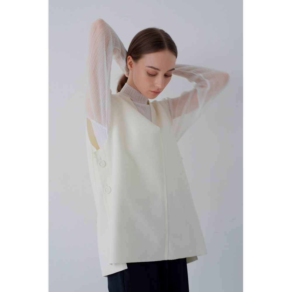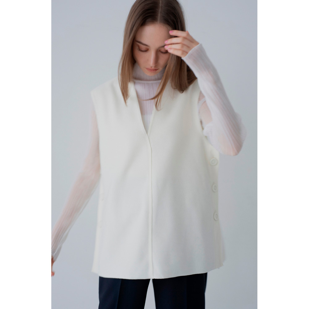 オールシーズン使えるベストが登場。V字のカッティングに拘り、重ね着しやすい絶妙なデザインにしたことで、インナーを選ばず様々なスタイルにマッチします。ベストと同じ生地を使ったサイドボタンがアクセント。ボタンは外すことができ、スリットの深さを自由に調節し、お好みの着こなしが可能です。1枚持っているだけで、季節を問わず、様々なシーンで活躍するアイテムです。