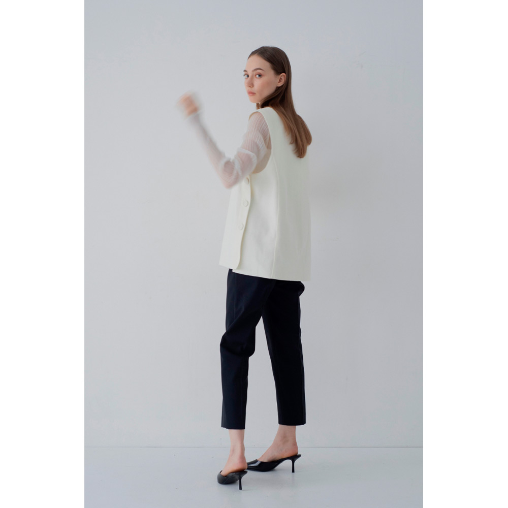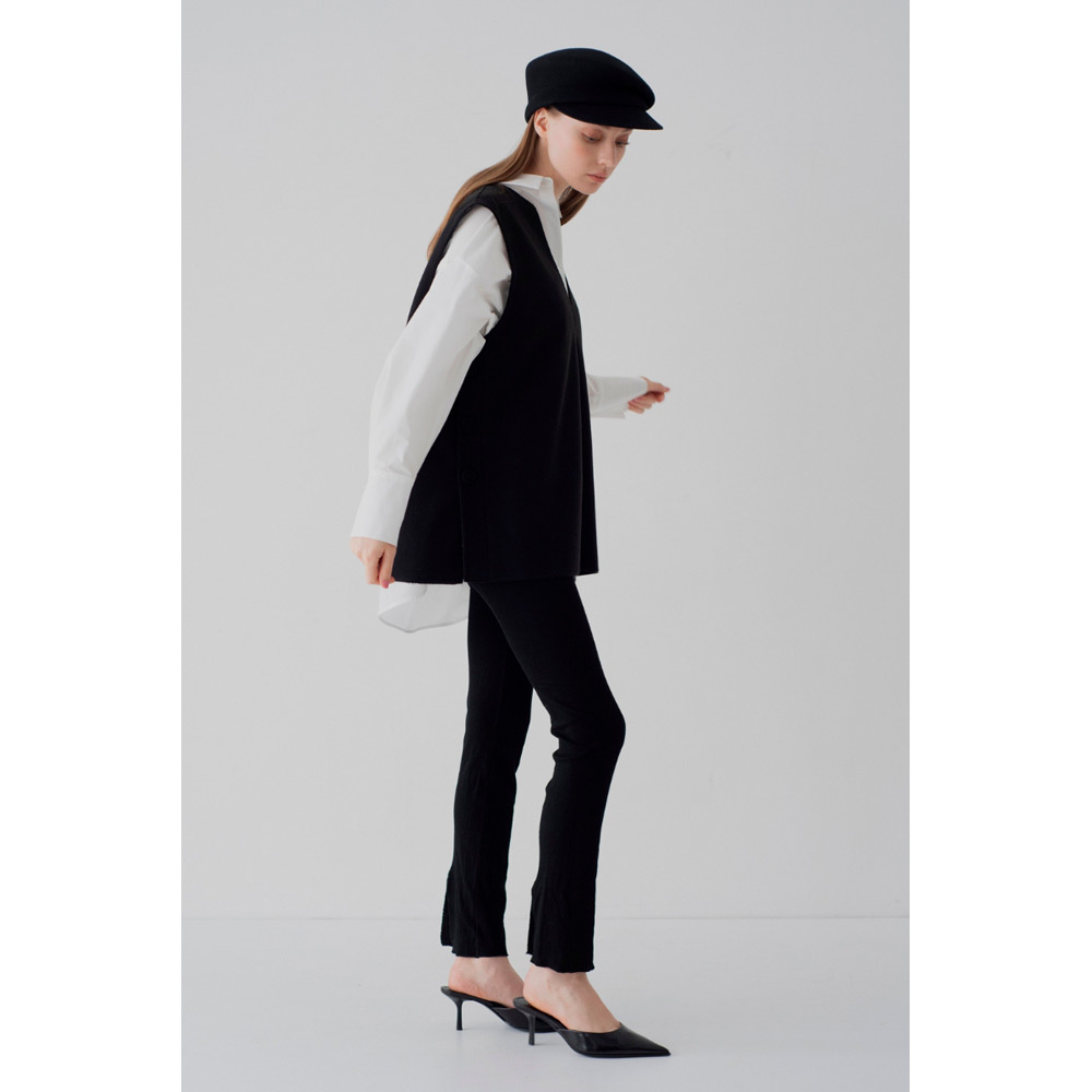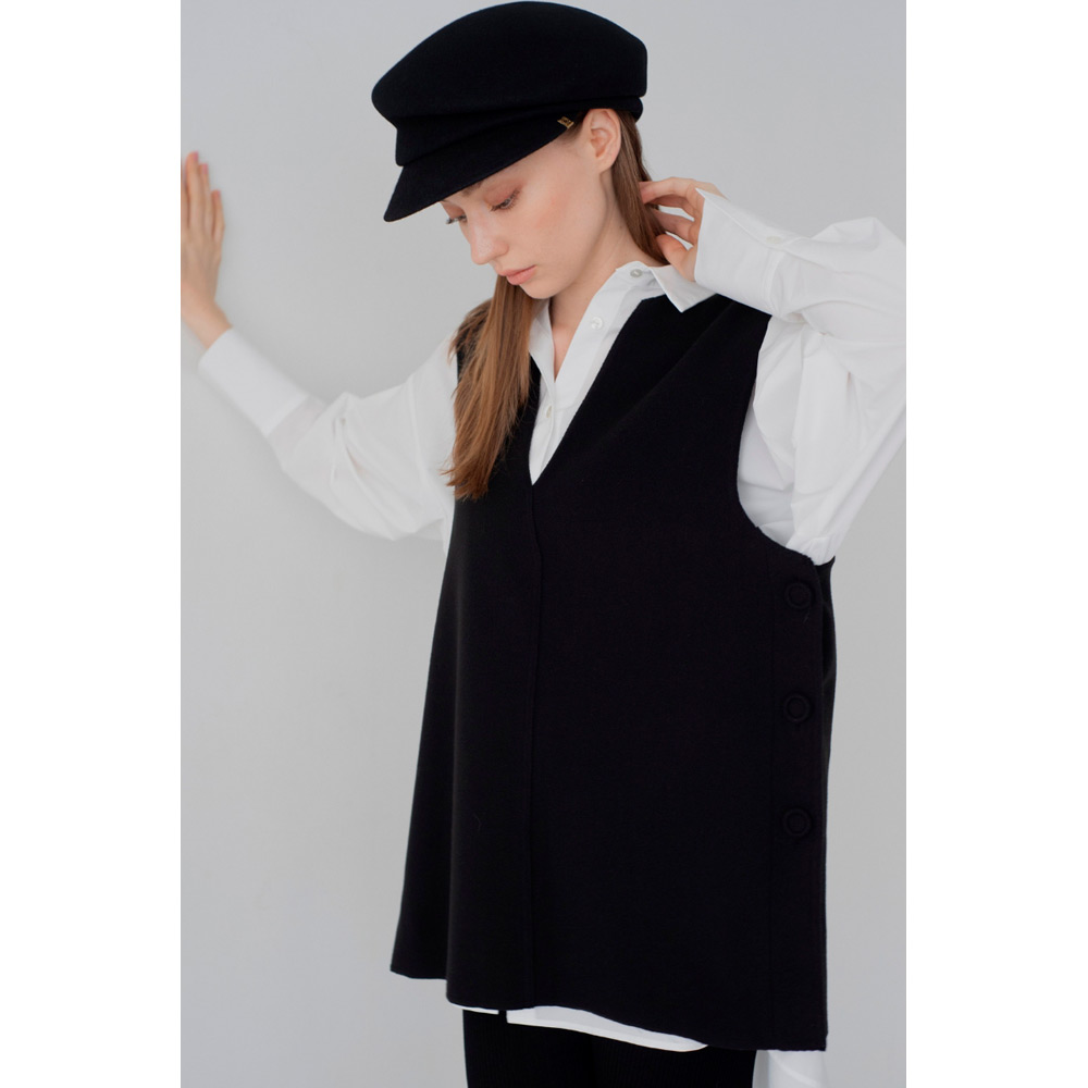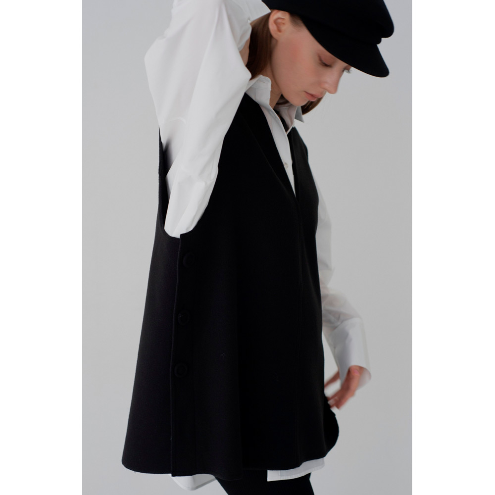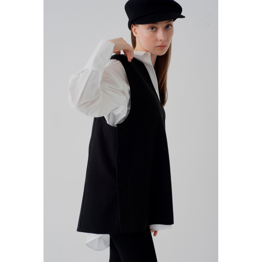 オールシーズン使えるベストが登場。V字のカッティングに拘り、重ね着しやすい絶妙なデザインにしたことで、インナーを選ばず様々なスタイルにマッチします。ベストと同じ生地を使ったサイドボタンがアクセント。ボタンは外すことができ、スリットの深さを自由に調節し、お好みの着こなしが可能です。1枚持っているだけで、季節を問わず、様々なシーンで活躍するアイテムです。