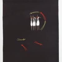 美しい声で鳴く鶴の群れに、松葉を添えたデザインです。こげ茶地に、朱と抹茶色で刺しゅうされた松葉がポイントになっています。