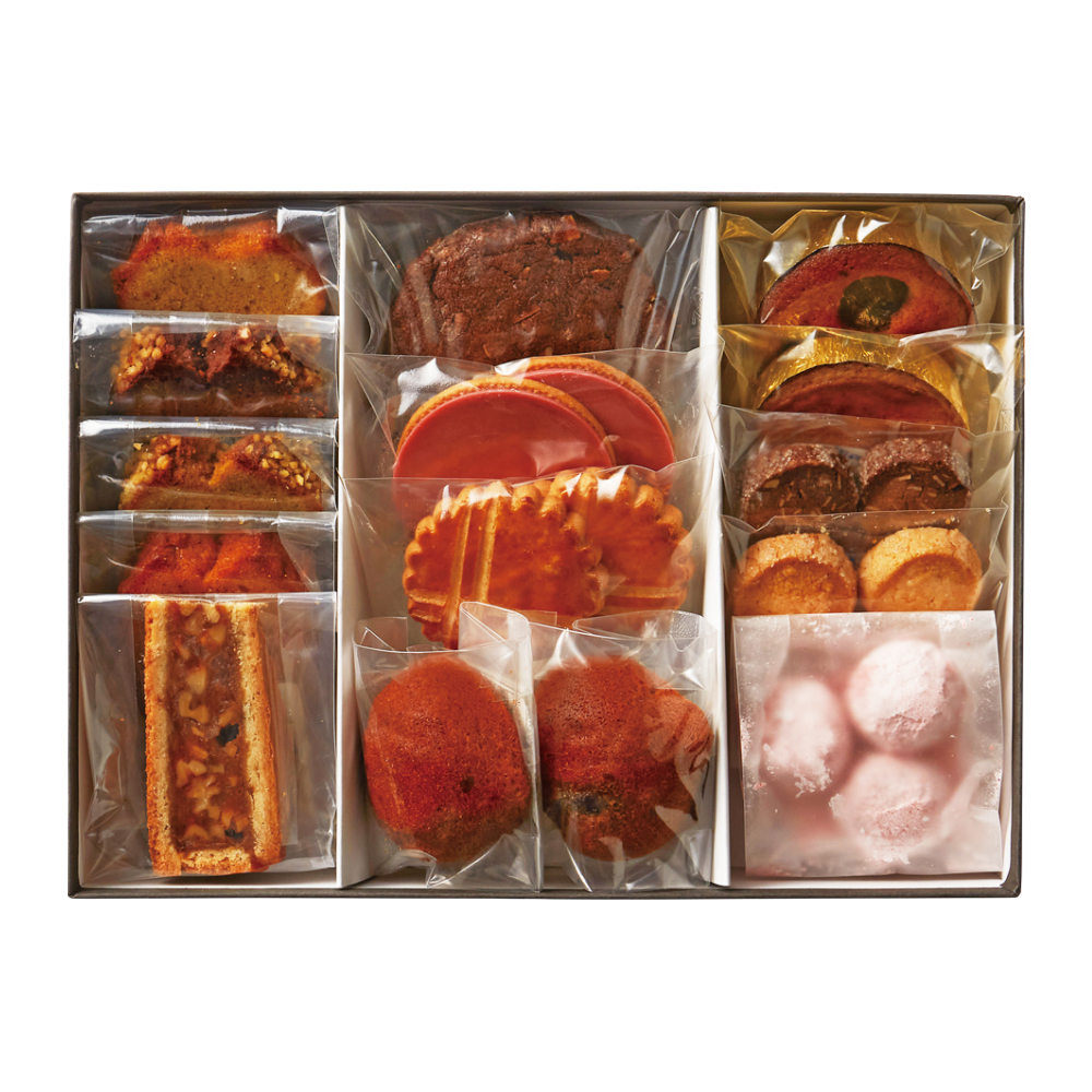 ケークマロン×2、エンガディーヌ、パレフレーズ、ガレットブルトンヌ、グリオッティーヌ、ケーク(バニーユ、アマンドショコラ、ピスターシュ、キャラメル)、ほか計14種23点