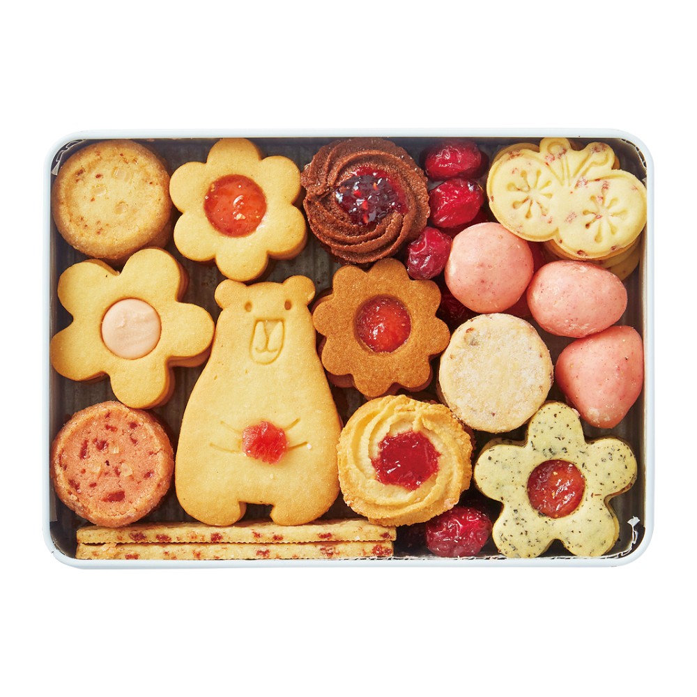 3品種の苺の特徴を生かしたジャムクッキーを中心に、多彩な味わいや食感をお楽しみいただけるクッキー缶。