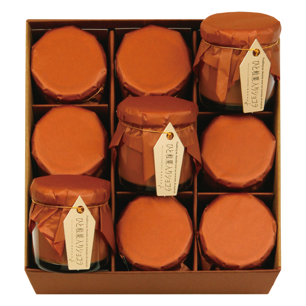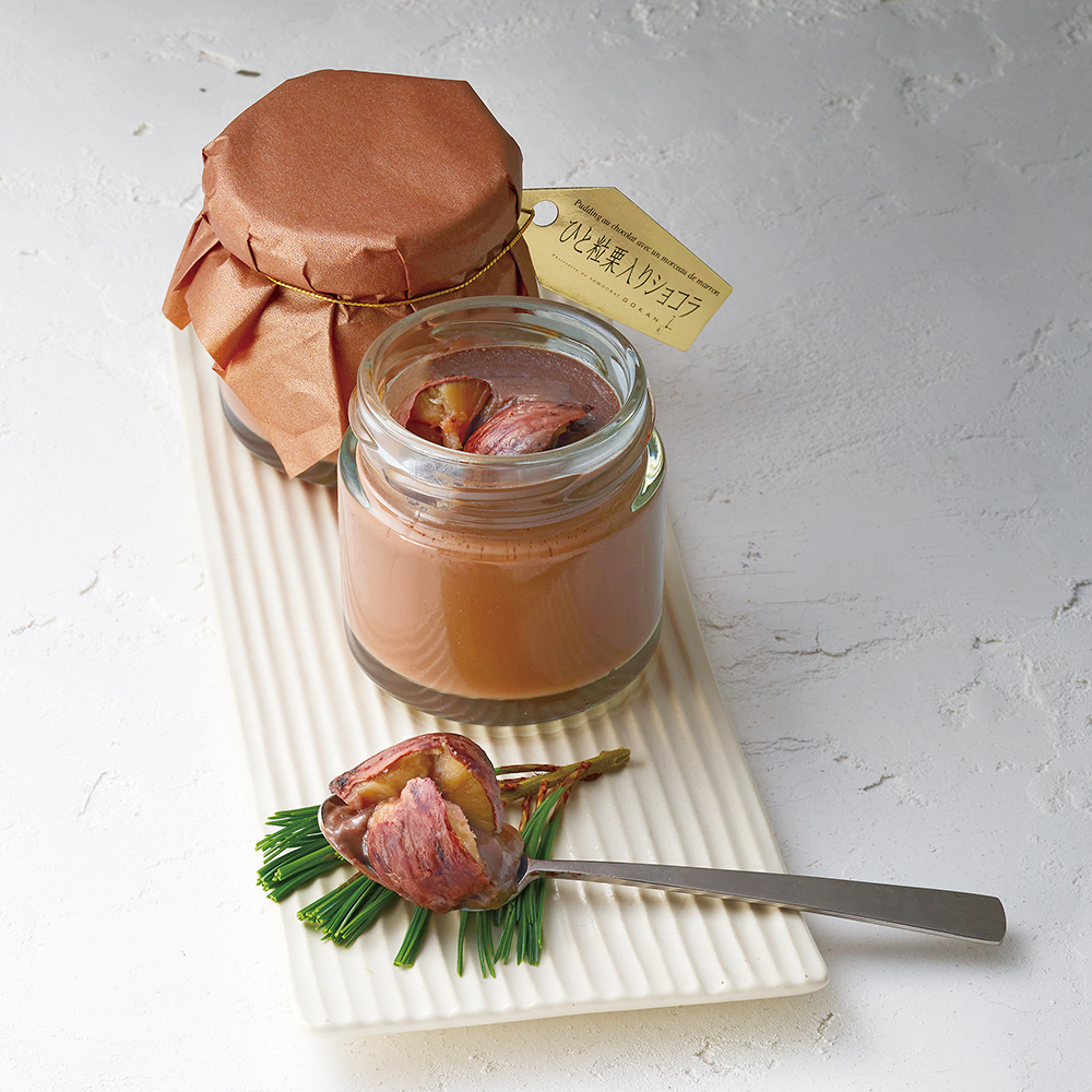 ブレンドしたチョコレートに生クリームを加え、ほっくりとした国産栗を丸ごとひと粒入れた、プリンのチョコレートデザート。
