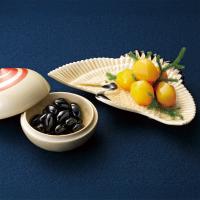 丹波産黒大豆の甘露煮と国内産栗をセットで。〈吉兆〉ならではの上品な甘さが、祝いの席をおいしく彩ります。