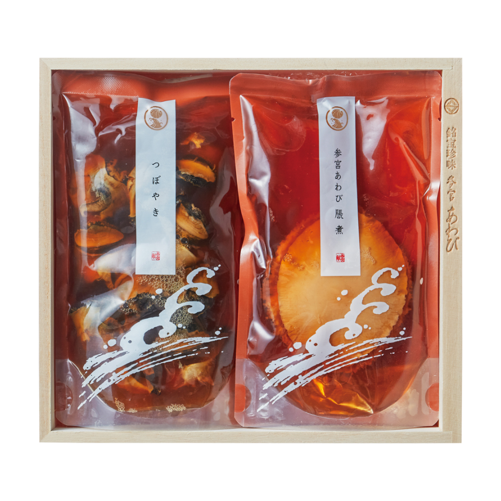 「参宮あわび脹煮」と「つぼやき」の詰め合わせ。鮑と赤にし貝を独自の脹煮製法で、ふっくらやわらかく仕上げました。