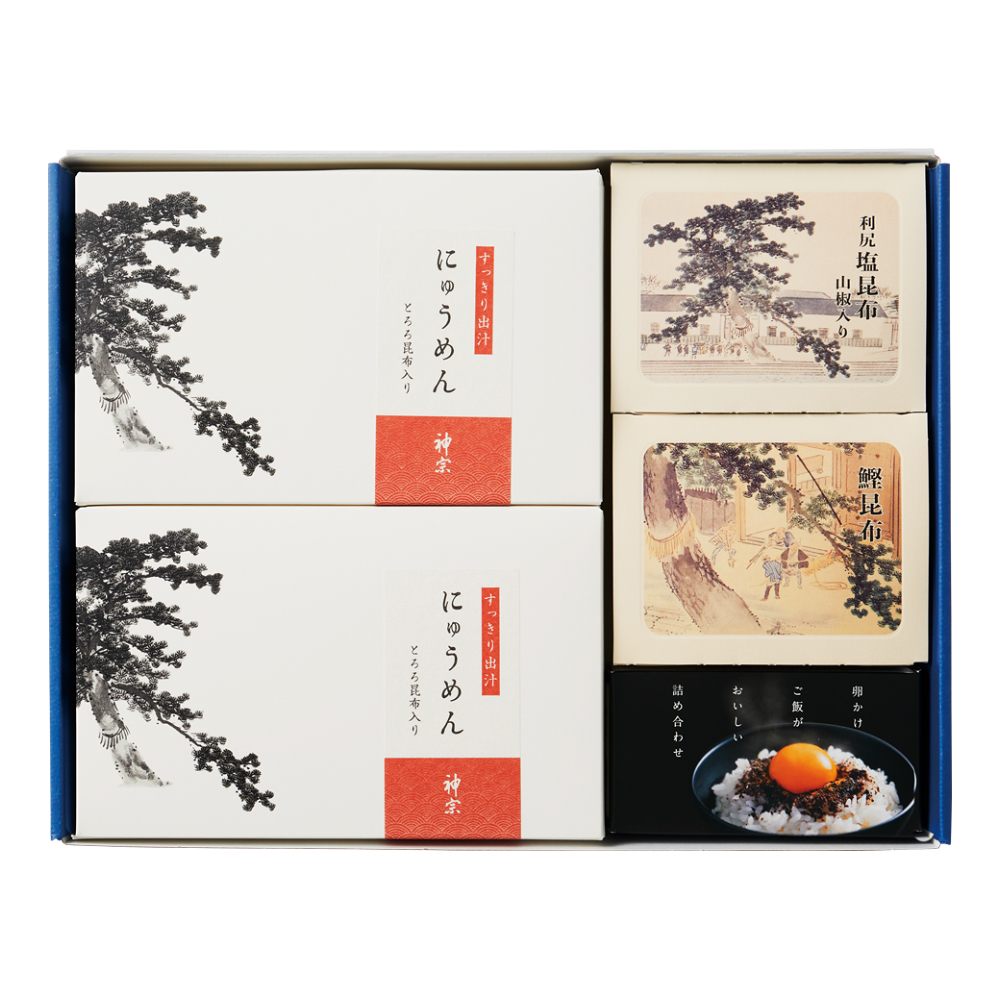 利尻塩昆布山椒入り110g、鰹昆布80g、神宗のにゅうめんすっきり出汁195g×2、卵かけご飯がおいしい詰め合わせ4食入り