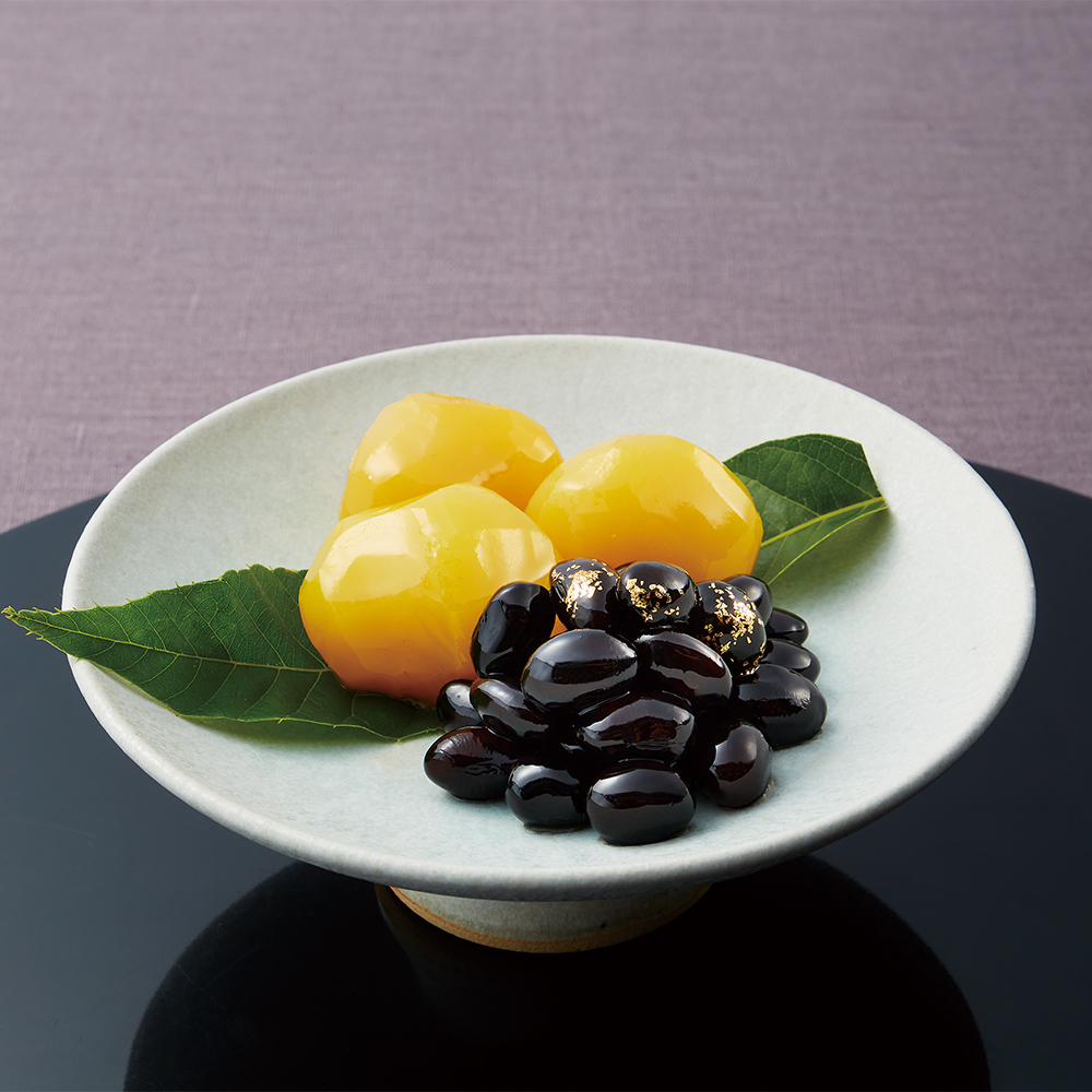 兵庫県産の丹波黒を手作業で選別し、ふっくらと艶やかに炊き上げた「丹波黒大豆煮豆」。栗が持つ上品な甘みとやさしい風味を引き出した「丹波栗甘露煮」も一緒に。