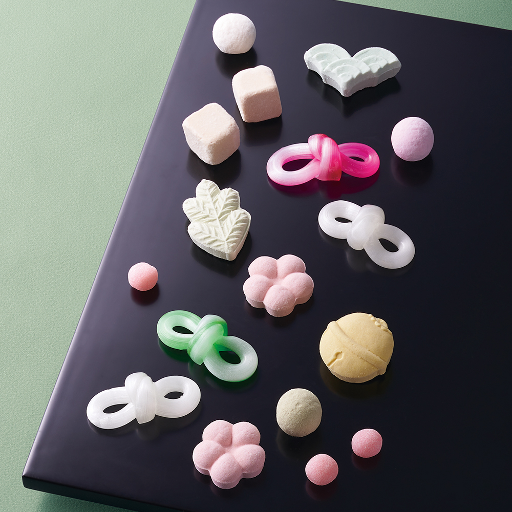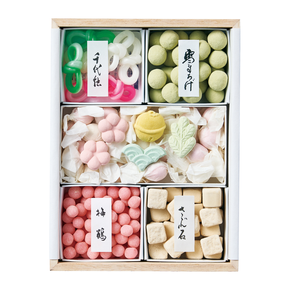 飴細工 千代結×7個、雪まろげ 80g、雪まろげ 抹茶40g、さざれ石20g、梅鶴50g、和三盆糖製お干菓子×5個