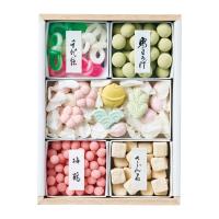 5種類の御干菓子を木箱に詰め合わせ。上品かつ繊細な味わいをお楽しみください。贈りものに最適な一品です。