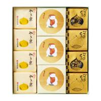 代表銘菓「やき栗」と、渋皮栗をこし餡で包んだ「ゴールドくり」、「黒糖わらび餅」を詰め合わせ。