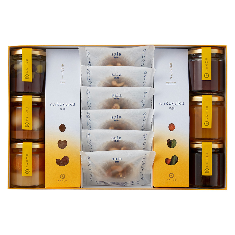燦樂×6、咲朔(野菜チップス)×1、咲朔(果物ゼリー)×1、果羹(みたらし・かのこ・温州蜜柑ゼリー・マンゴーピーチ・わらびもち・水ようかん各1)