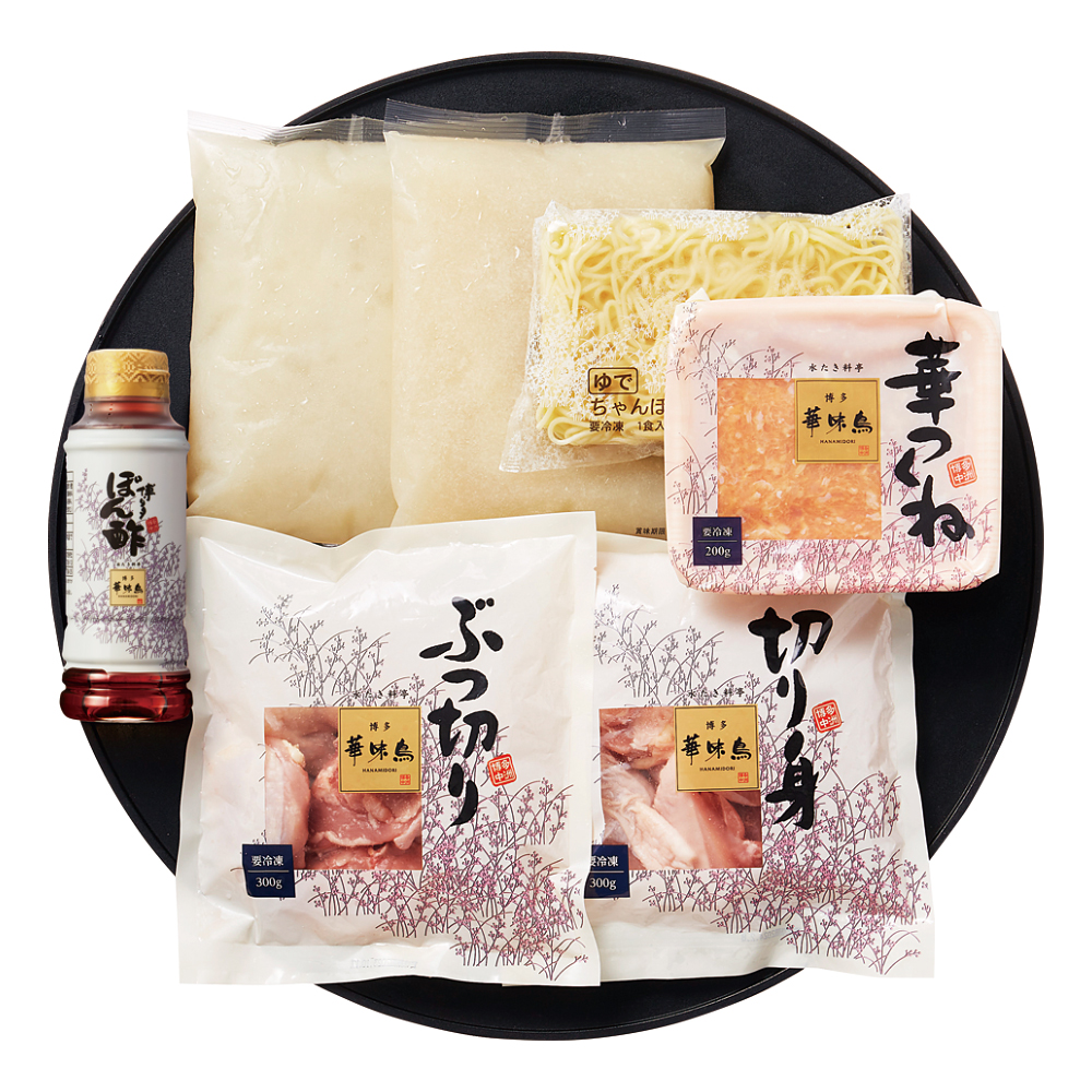 水たきスープ600g×2、華味鳥(切り身)300g、華味鳥(ぶつ切り)300g、華つくね200g、博多ぽん酢220ml、ちゃんぽん麺150g、3~4人前